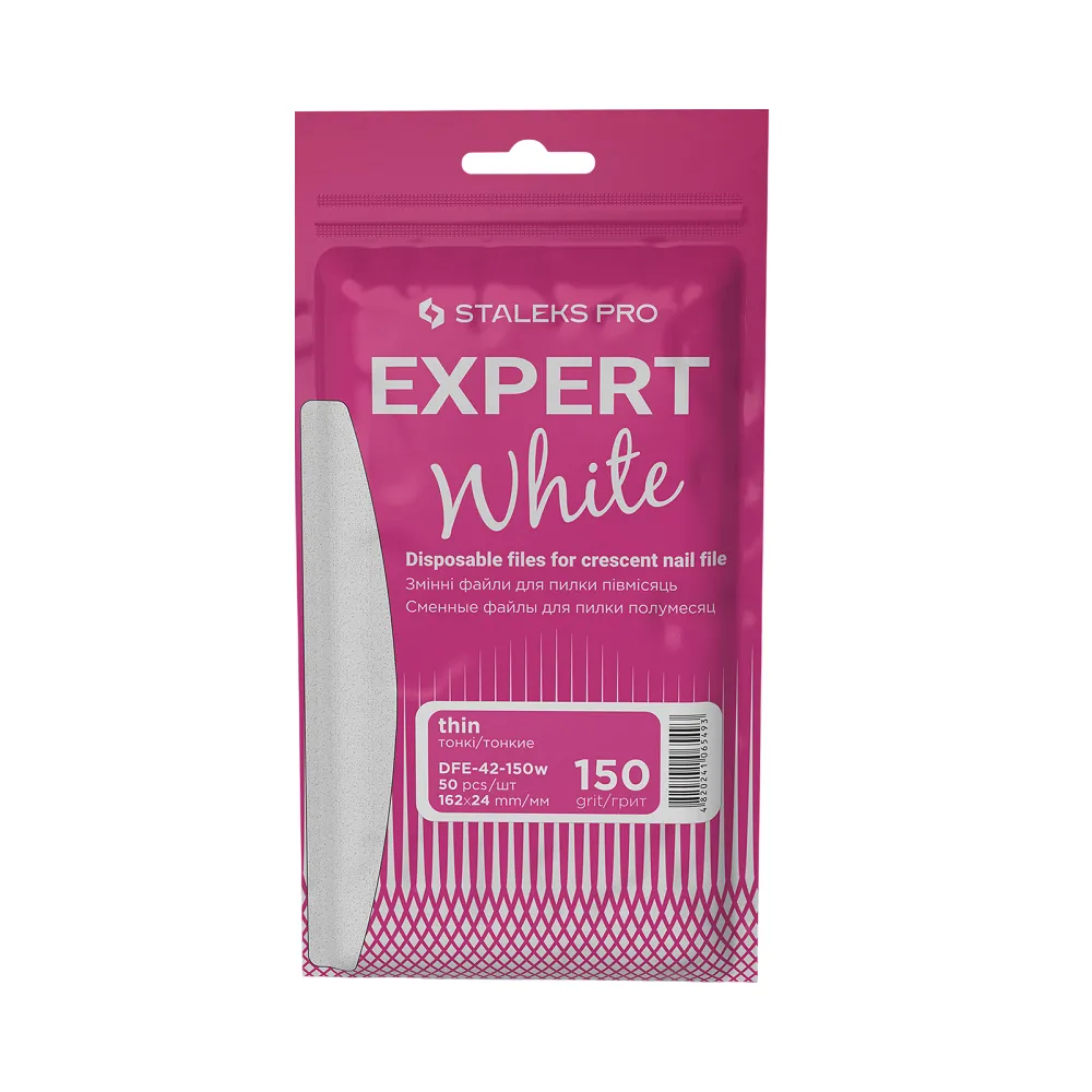 Пилочка - важливий інструмент для майстра манікюру та педикюру. За стандартами сучасного вона повинна бути не тільки продуктивною, а й гігієнічною. Для цього на ринку з`явився революційний винахід - одноразовий абразив, абсолютно новий для кожного клієнта. EXPERT 42 - великий набір тонких змінних файлів у формі півмісяця. Легко надягаючи на відповідну основу, вони дозволяють швидко приступити до роботи та залишають сервіс безпечним при великому потоці клієнтів. Абразив справляється із завданням продуктивно та якісно, а потім – одразу утилізується. Особливості продукту: Набір змінних файлів БІЛІ (50шт) для пилки півмісяць 150 грит EXPERT 42 (DFE-42-150w) STALEKS PRO Переваги білих змінних файлів: Набір змінних файлів БІЛІ (50шт) для пилки півмісяць 150 грит EXPERT 42 (DFE-42-150w) STALEKS PROНабір змінних файлів БІЛІ (50шт) для пилки півмісяць 150 грит EXPERT 42 (DFE-42-150w) STALEKS PRO