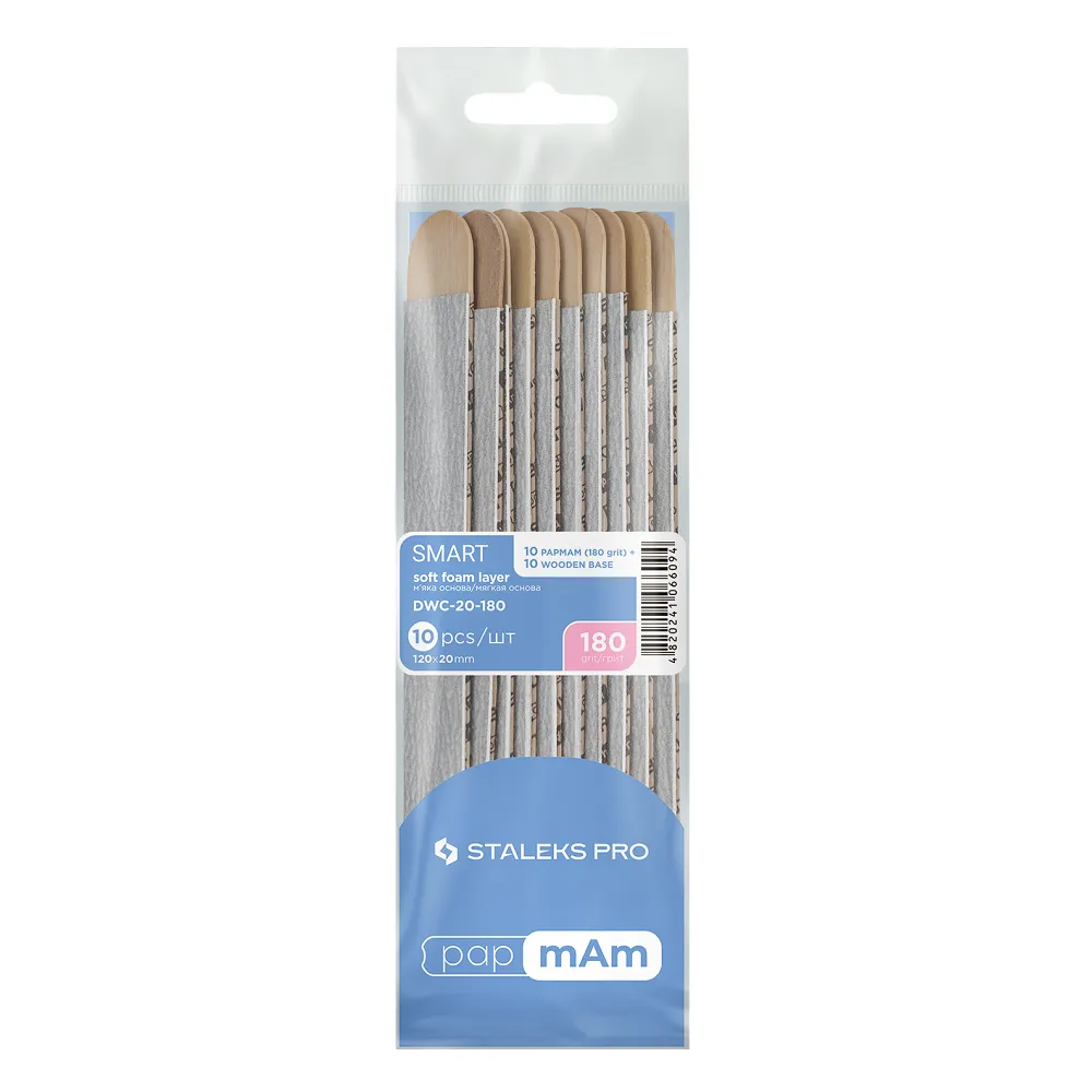 Набір papmAm Smart 20 - це десять змінних файлів на дерев`яній основі. Гритне полотно посаджено на м`яку піну, що амортизує при опилі, щоб зробити кожен рух спрямованим та плавним, а також додатково захистити нігті від пошкоджень. Особливості продукту: Набір змінних файлів papmAm (10шт) м`які на дерев`яній основі 180 грит SMART 20 (DWC-20-180) STALEKS PROНабір змінних файлів papmAm (10шт) м`які на дерев`яній основі 180 грит SMART 20 (DWC-20-180) STALEKS PRO