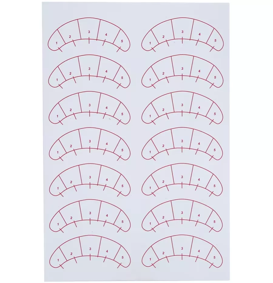 Самоклеючі патчі — незамінний атрибут лешмейкерів при виконанні нарощування. Патчі мають самоклеючу щільну основу і добре фіксуються, прилягаючи до шкіри. Патчі не сповзають і забезпечують захист ніжної шкіри нижньої повіки. Також патчі доповнені спеціальною розміткою, що дозволяє спростити процедуру, завдяки чудовій можливості швидко коригувати створювану довжину. У комплекті 70 пар.Наклейки з розміткою для нарощування вій