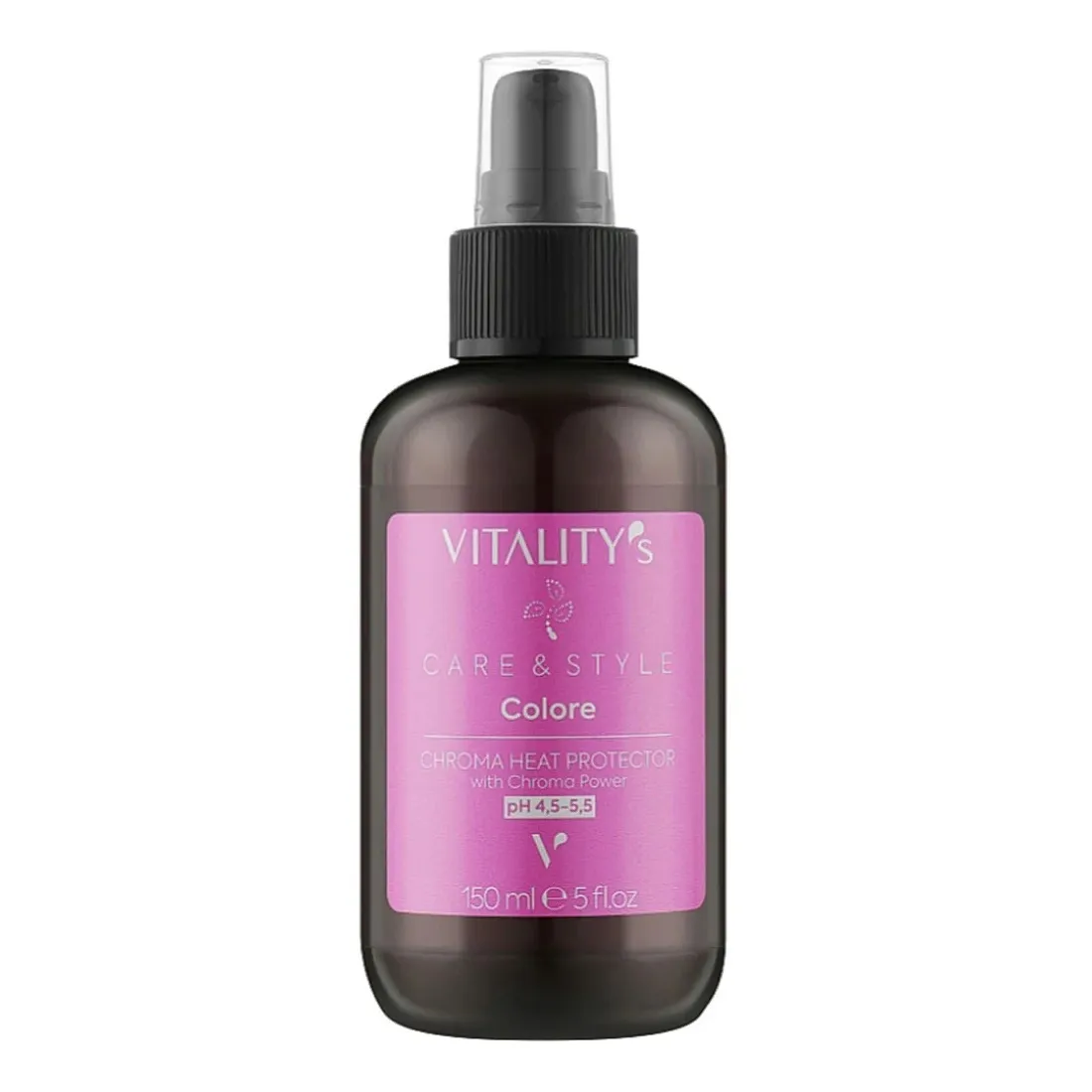 Незмивна термозахисна сироватка для фарбованого волосся Chroma Heat Protector це багатофункціональний продукт, який захищає колір і зволожує волосся, зменшуючи сухість і ламкість. Розгладжує поверхню волосся, зміцнюючи їх внутрішню структуру і посилюючи блиск. Особливості продукту: комплекс з аміно-кислот і пантенолу зменшує окислювальний стрес і захищає волосся, зберігаючи кератин неушкодженим; масло мурумуру для м`якого, шовковистого гладкого волосся; бетаїн розгладжує поверхню пошкодженого волосся, відновлюючи блиск, проникаючи в кору і зміцнюючи його структуру; захищає волосся від прямого нагріву стайлерів, а також гарячого повітря фена; антифриз ефект; pH 4,5 - 5,5. Ультралегкий пом`якшувальний засіб: 100% рослинного походження, живить і підсилює блиск кольору. Легко вбирається. Застосування: нанесіть на підсушене рушником або попередньо висушене волосся по довжині та кінчикам, щоб захистити від гарячого потоку повітря фену,і приступайте до укладання. Нанесіть на сухе волосся як завершальний етап проти пухнастості, а також перед використанням стайлерів для випрямлення чи накрутки. Також можна наносити окремо від стайлінгових процедур щоб посилити блиск.Сироватка-крем з термозахистом для фарбованого волосся Chroma Heat Protector Colore Care&Style Vitality`s