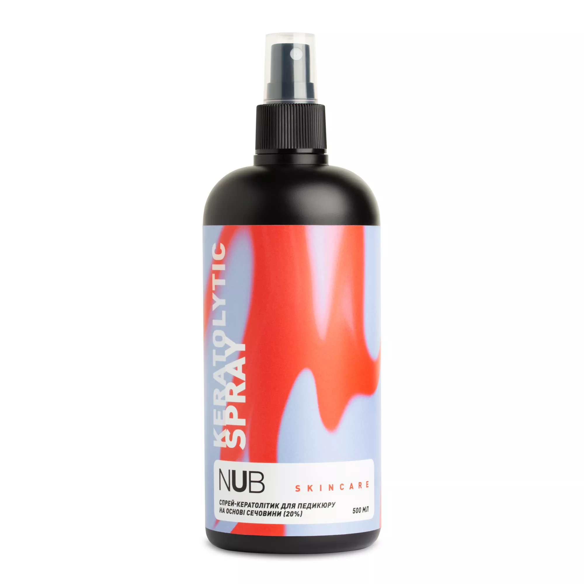 NUB Skincare Keratolytic Spray / Спрей-кератолітик для педикюру на основі сечовини 20% / 500 мл — це професійний кератолітик швидкої дії у формі спрею призначений для зняття ороговілих шарів шкіри стоп. Активною речовиною засобу є сечовина — природний складник шкіри людини; ТЕХНОЛОГІЯ ВИКОРИСТАННЯ 1. Підходить для щоденного використання та як завершення процедури 3. Забрати точкові сильні огрубіння фрезою або пододиском на суху