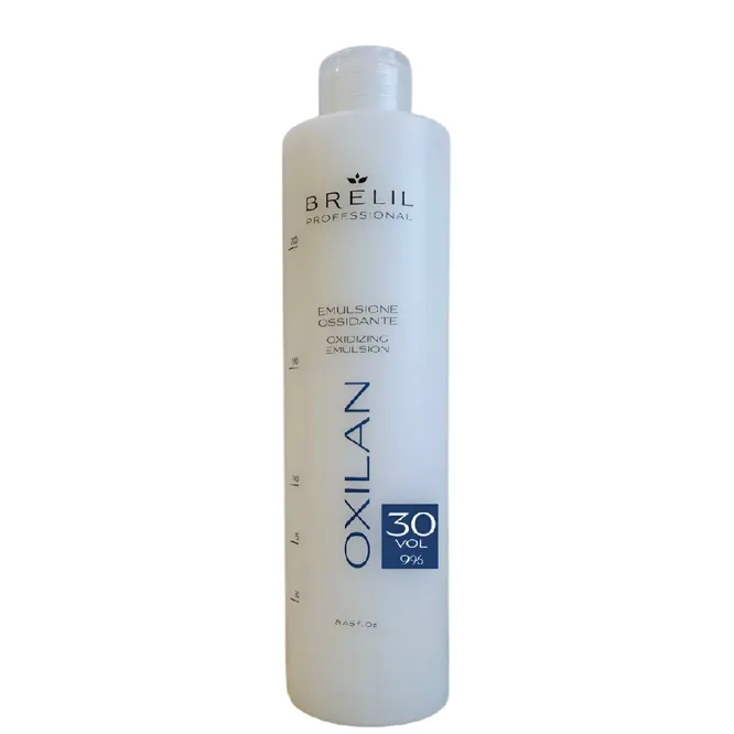 Окислювальна емульсія Emulsione Ossidante OXILAN гарантує ідеальний результат при фарбуванні або освітленні волосся. Завдяки своїй формулі, збагаченій емульгатними речовинами, захищає і кондиціонує волосся. Окислювач ефективно освітлює волосся не руйнуючи його структуру і не провокуючи зайву пористість після фарбування волосся. Кремоподібна консистенція легко поєднується з барвниками та освітлювальною пудрою. Має приємний запах. Окислювальні емульсії OXILAN BRELIL представлені в асортименті: 3% (10 Vol), 6% (20 Vol), 9% (30 Vol). Всі окислювачі змішуються між собою для отримання проміжних процентних співвідношень. Застосування: для досягнення бажаного результату фарбування або освітлення волосся, вибирайте відповідний відсоток окислювальної емульсії. Застосовувати з барвниками PRESTIGE і знебарвлювальними продуктами. Пропорції змішування зазначена в інструкції щодо застосування барвників. Окислювальна емульсія Emulsione Ossidante OXILAN BRELIL