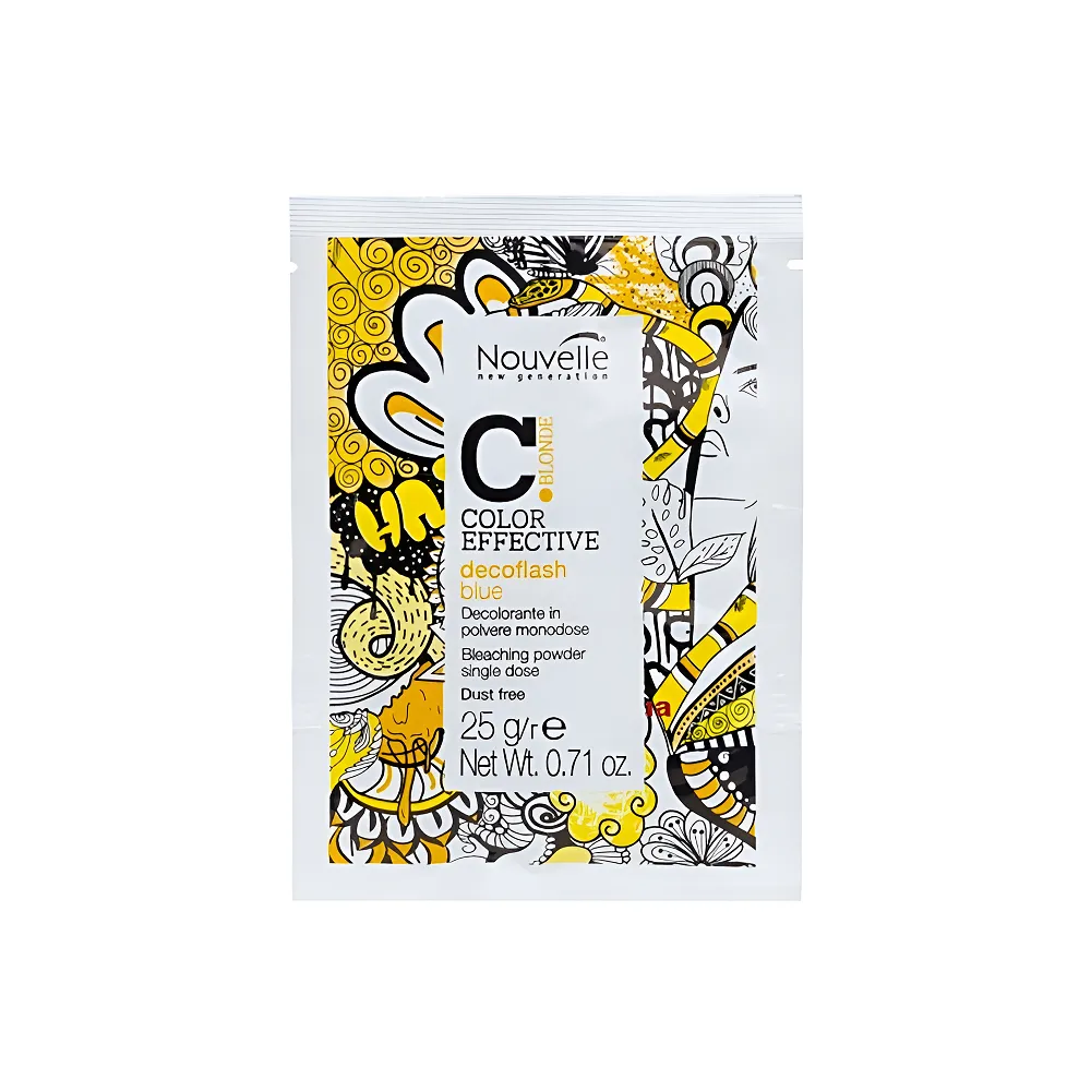 Освітлювальний порошок Decoflash з інноваційною формулою призначений для будь-якої професійної техніки освітління. Освітлює волосся до 6 тонів. Завдяки натуральним доглядаючим компонентам у складі, волосся насичується корисними мікроелементами і нормалізується водний баланс. Освітлення відбувається інтенсивно, але при цьому структура волосся не пошкоджується. При змішуванні з окислювачем Decoflash утворює м`який однорідний крем, який не піниться і не застигає. Активні компоненти: Освітлювальна пудра для волосся (6 levels), 25 г Decoflash Blue COLOR EFFECTIVE BLONDE Nouvelle Застосування: Освітлювальна пудра для волосся (6 levels), 25 г Decoflash Blue COLOR EFFECTIVE BLONDE Nouvelle Змішується в неметалевій ємності з окислювальною емульсією (3%, 6%, 9%, 12% в залежності від рівня освітлення) в пропорції 1: 2 (на кожні 25 г порошку додавати 50 мл окисника); Час витримки 20-50 хвилин в залежності від: природного відтінку волосся, типу і стану волосся, відсоток використовуваного окисника для бажаного ефекту. При застосуванні теплових приладів час витримки скорочується в 2 рази. Важливо: перед застосуванням необхідно ретельно перемішувати Decoflash з окислювачем протягом 1-2 хвилини до отримання в`язкої емульсії. Рекомендується використовувати для професійного застосування.Освітлювальна пудра для волосся (6 levels) Decoflash Blue COLOR EFFECTIVE BLONDE Nouvelle