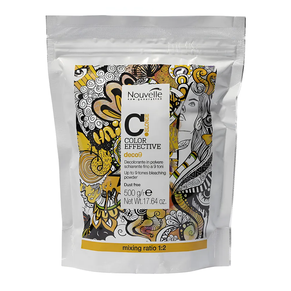 Освітлюючий порошок Deco9 має посилену дію, знебарвлює до 9-ти тонів. Безпечний для волосся і простий в застосуванні. Ідеально підходить для будь-яких технік. Містить захисні компоненти: Застосування: Освітлювальна пудра для волосся (9 levels), 500 г Deco9 COLOR EFFECTIVE BLONDE Nouvelle У неметалевої ємності змішати до стану однорідного крему 1 частина порошку (25г) і 2 частини окисної емульсії (50г). Допускається співвідношення 1:3, 1:4. Рекомендується застосовувати з окислювачем від 1,5% до 9%. Максимальний час витримки 60 хвилин. Процентний склад окислювача і час витримки підбираються відповідно до початкового стану волосся і бажаного рівня освітлення.Освітлювальна пудра для волосся (9 levels) Deco9 COLOR EFFECTIVE BLONDE Nouvelle
