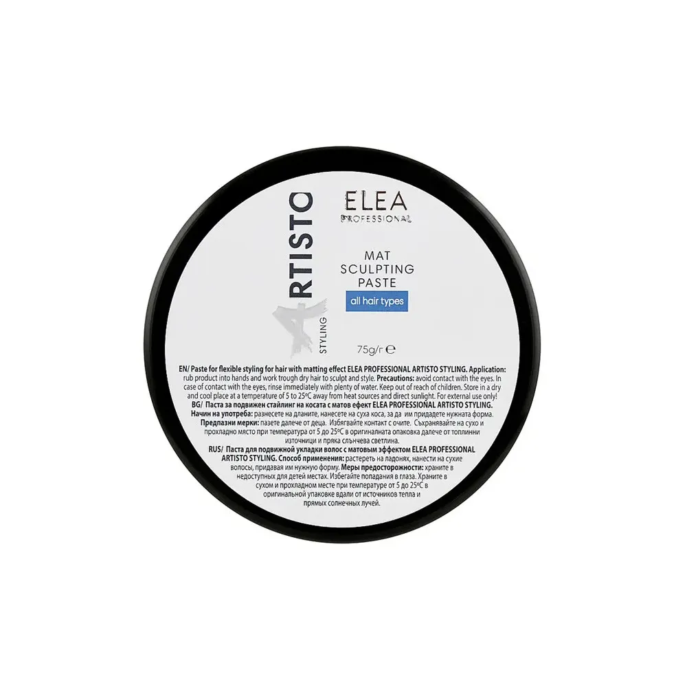 Паста для укладання волосся Mat Sculpting Paste входить до категорії стайлінгу "без блиску". Не є акцентним стайлінгом, наголошує на структурі волосся. Продукт не помітний на волоссі, не залишає білого нальоту та не зажирняє волосся. Застосовується для креативного стайлінгу, підкреслюючи рух волосся і дає напрямок укладання, яке можна змінювати протягом дня. Немає жорсткої фіксації. Особливості продукту: Активні компоненти: ланолін, каолін. Застосування: розтерти на долонях, нанести на сухе волосся, надати їм потрібної форми.Паста з матовим ефектом для рухливої укладки волосся Mat Sculpting Paste Styling ARTISTO ELEA Professional