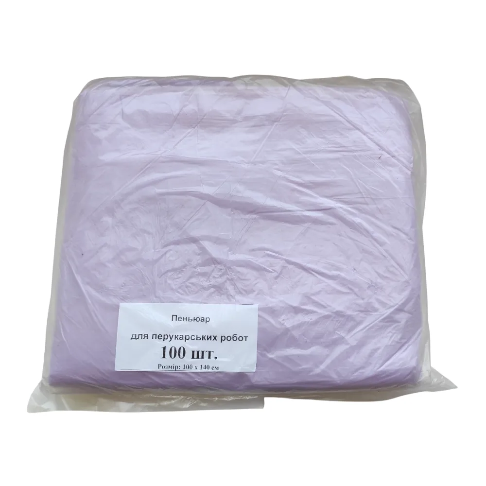 Цей одноразовий пеньюар ідеально підходить для захисту одягу клієнта під час фарбування, стрижки чи укладки волосся. Виготовлений з поліетилену. Пеньюар дозволяє майстрам заощадити час на прання та приготування нових засобів для роботи, тим самим підвищуючи ефективність роботи салону. Особливості продукту: Застосування: для салонів краси, перукарень, спа-процедур та інших закладів, де важливо дотримуватись гігієнічних стандартів. Кількість в упаковці: пачка містить 100 пеньюарів.Пеньюар для перукарських робіт 100х140 см (в пачці) з поліетилену Перукарські аксесуари