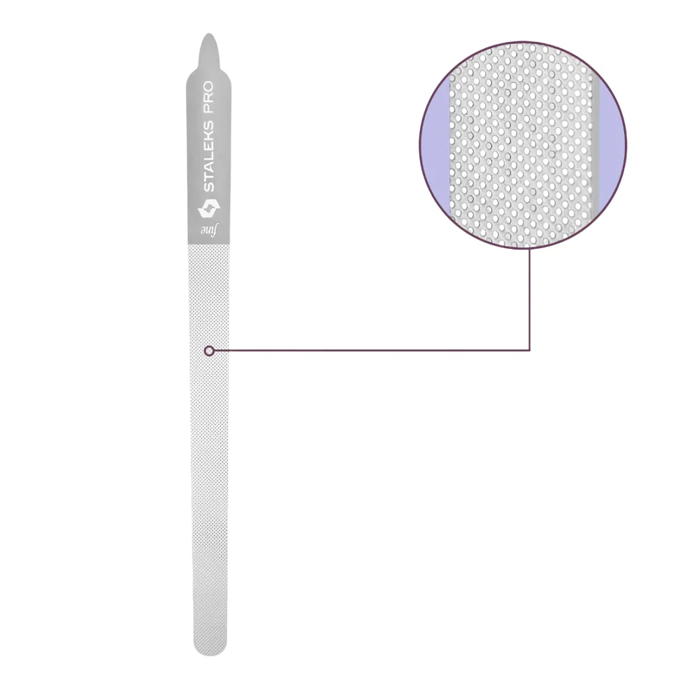 Лазерна пилка EXPERT 11 - професійний інструмент для обробки нігтьової пластини будь-якої жорсткості, довжини та форми. Укоротити нігтики, надати їм модної форми, заокруглити гострі куточки, відшліфувати огрубілі шкірні валики без подряпин та травм - це може зручна пилка FE-11-155. Якісне та суперстійке алмазне напилення не порушує цілісність пластини, нігтики після обробки не ламаються, не тріскаються і не шаруються. Пилка - двостороння, обидві сторони робітники. Насічки-"сонячки" позначають бік високої жорсткості, насічки-"зірочки" - середньожорстку. Особливості продукту: Пилка для нігтів лазерна EXPERT 11 (FE-11-155) STALEKS PROПилка для нігтів лазерна EXPERT 11 (FE-11-155) STALEKS PRO