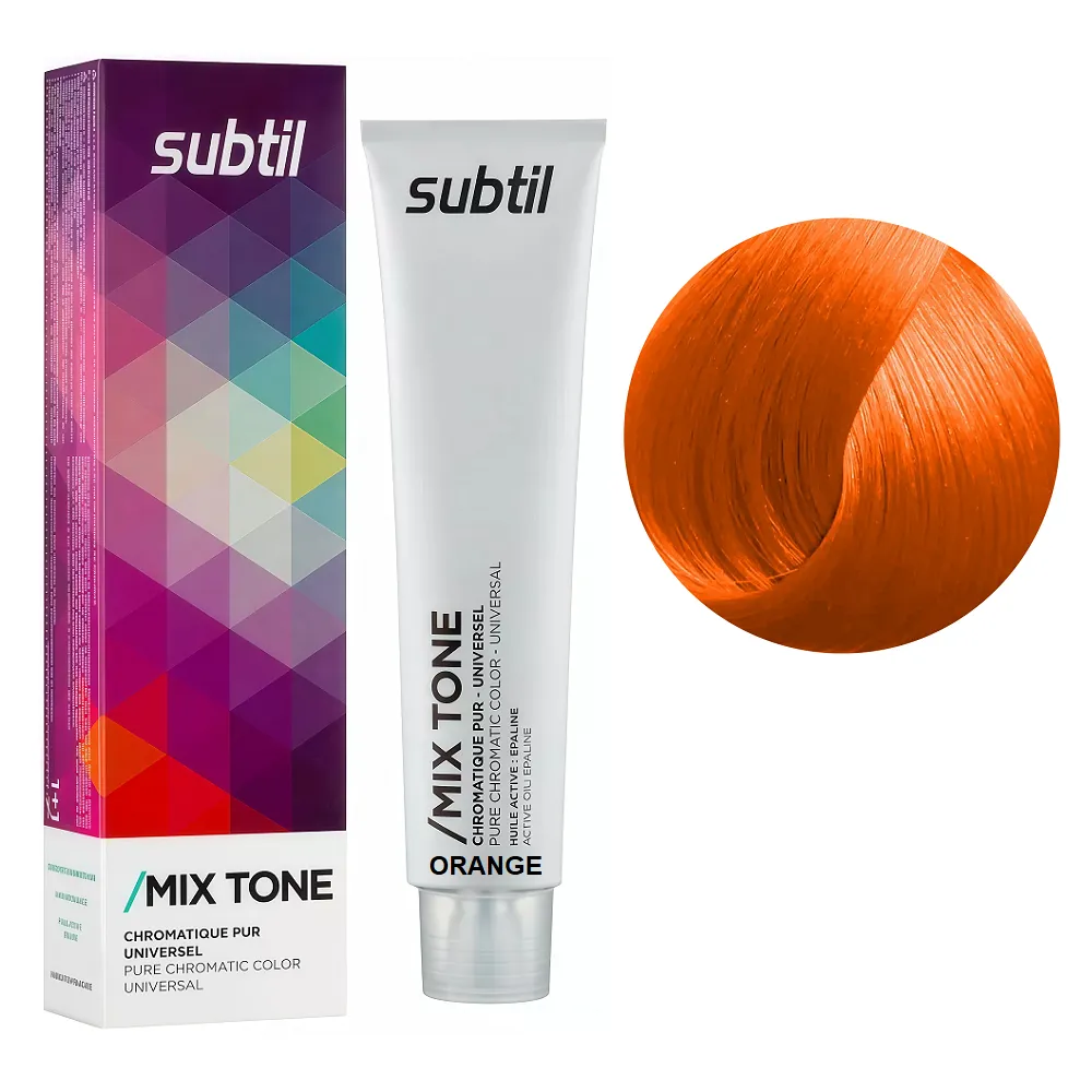 Subtil MIX TONE - стійка крем-фарба, концентрат фарбувальних речовин без аміаку, яка надає насичений відтінок, здорове волосся, сяючий блиск та розкішний вигляд! В асортименті MIX TONE вісім основних відтінків (фіолетовий, синій, маджента, жовтий, помаранчевий, перламутровий, зелений, графіт) MIX TONE виконують три основні функції: створення відтінку при прямому фарбуванні, посилення кольору та нейтралізація небажаних відтінків. Рекомендується застосовувати з усіма лінійками барвників SUBTIL Ducastel - тому фарба підходить для універсального використання при всіх техніках фарбування. Покриває волосся спеціальною плівкою, глибоко зволожує їх зсередини і живить структуру волосся, не обтяжує, додає блиск, еластичність, вже після першого використання. Також запобігає посіченість кінчиків і відновлює волосся під час фарбування. Застосування: Помаранчевий (ORANGE) Стійка крем-фарба без аміаку, 60 мл MIX TONE SUBTIL 2. Посилення кольору та нейтралізація небажаних відтінків: MIX TONE використовують в суміші з усіма лініями барвників SUBTIL з окислювачами Subtil Oxidant 3%, 6%, 9%, 12% або 2,7% в пропорції від 1 + 1 до 1 + 3 в залежності від фарбувальної суміші, яка використовується: Застосовувати фарбу слід, суворо дотримуючись інструкції, яка додається до кожної упаковки.Стійка крем-фарба без аміаку MIX TONE SUBTIL