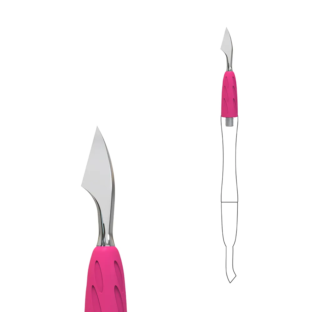 Сокирка для манікюру UNIQ 13 - прогресивний змінний модуль, який з’єднується з ручкою Combo UNIQ у результаті чого виходить повноцінний інструмент. Майстер може обирати на свій розсуд відповідно до потреб робочі частини модульної лопатки, отримуючи інструмент, який виконуватиме певні процедури. Лопатка «сокирка» призначена для ретельного очищення нігтьової пластини від птеригію, обробки бічних валиків, вільного краю при виконанні манікюру, педикюру. Виготовлений з високоякісної нержавіючої сталі та силікону. Його тонкий, гострий край гарантує бездоганну точність та швидкість виконання процедури. На звороті розташований різьбовий механізм з`єднання з ручкою. Силікон яскравого рожевого відтінку — гіпоалергенний і комфортний на дотик. Особливості продукту: Робоча частина лопатки Combo UNIQ 13 топірець WPPQ-13 STALEKS PROРобоча частина лопатки Combo UNIQ 13 топірець WPPQ-13 STALEKS PRO