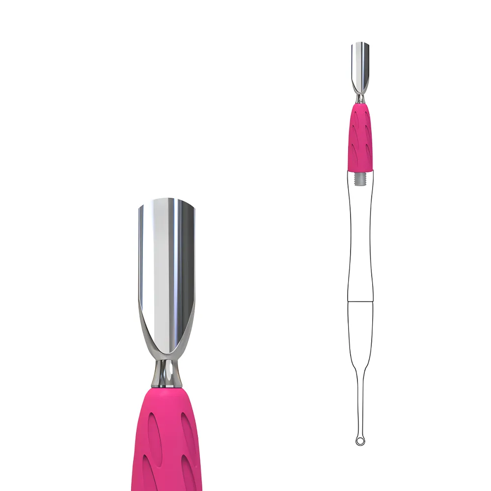 Пушер UNIQ 16 - інноваційний змінний модуль, який вкручується в ручку Combo UNIQ і допомагає створити ефективний інструмент. Майстер може вибирати та комбінувати робочі частини модульної лопатки, збираючи інструмент, що підходить під конкретну процедуру. Пушер застосовується при піднятті, відсуві кутикули, щоб полегшити її подальше видалення при виконанні манікюру, педикюру. Завдяки невеликому вигину він щільно прилягає до вузького та середнього нігтя, повторюючи форму нігтьової пластини. На звороті розташований різьбовий механізм з`єднання з ручкою. Силікон яскравого рожевого відтінку — гіпоалергенний і комфортний на дотик. Особливості продукту: Робоча частина лопатки Combo UNIQ 16 пушер округлий вузький WPPQ-16 STALEKS PROРобоча частина лопатки Combo UNIQ 16 пушер округлий вузький WPPQ-16 STALEKS PRO