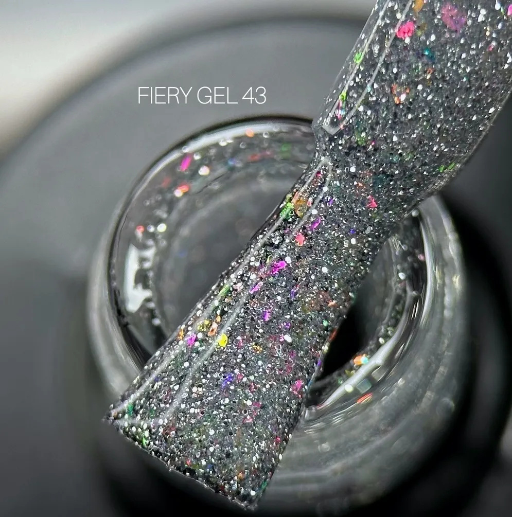 • Колір гель-лак Fiery №43 –  світло-сірий з додаванням фіолетових пластівців юкі та світловідбиваючого шимеру;