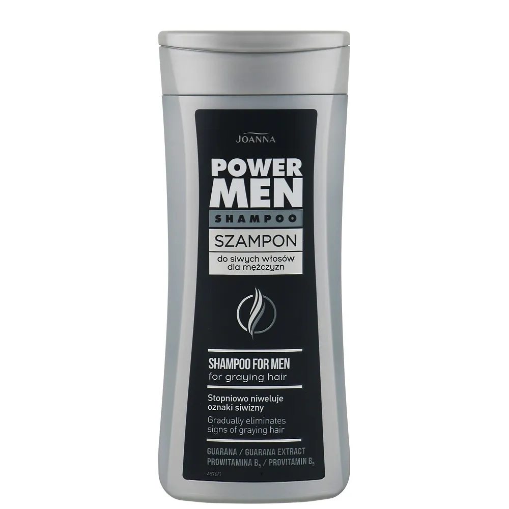 Шампунь Power Men від сивини призначений для чоловіків, у яких вже є срібні пасма на скронях або по всьому волоссю. Він поступово зменшує сивину, непомітно відновлює темніший колір волосся, а також ефективно доглядає за чоловічим волоссям, яке потребує спеціального догляду. Збагачений екстрактом гуарани та провітаміном B5 – обидва інгредієнти ефективно зволожують волосся. Особливості продукту: Шампунь для чоловіків для сивого волосся, 200 мл For Graying Hair Shampoo POWER MEN Joanna Застосування: Шампунь для чоловіків для сивого волосся, 200 мл For Graying Hair Shampoo POWER MEN Joanna Перед застосуванням шампуню для сивого волосся промити волосся очищувальним шампунем. Нанести шампунь для сивого волосся на вологе волосся, залишити діяти на 2-5 хвилин, ретельно змити.Шампунь для чоловіків для сивого волосся For Graying Hair Shampoo POWER MEN Joanna