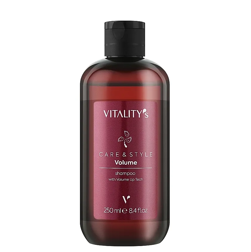 Шампунь для об`єму Shampoo Volume Care&Style Vitality`s м’яко та дбайливо очищує волосся та шкіру голови. Його чудові очищуючі властивості видаляють забруднення, залишаючи волосся ідеально чистим. Кремова компактна піна створює приємне відчуття легкості та м`якості на дотик. Рослинний склад з екстрактів ехінацеї, лісового горіха та рису забезпечує волоссю зволоження, а пантенол дарує їм шовковистість. Засіб збагачений запатентованою технологією Volume Up яка робить волосся об`ємнішим, густішим, еластичнішим. Особливості продукту: V.E.G. Mix зі зволожуючими і антиоксидантними властивостями; технологія Volume up додає об’єм і еластичність волосся; Quaterium 87 обволікує волосся, полегшує розчісування вологого та сухого волосся, зменшує статику, роблячи його шовковистим, блискучим та слухняним; кондиціонуючий полімер Polyquaternium 10 зменшує електростатичний заряд, допомагає розплутати волосся та посилює блиск; пантенол (провітамін B5) зволожує волосся, зберігає внутрішню вологість та має поліруючу дію. Застосування: розподіліть продукт по вологому волоссю і шкірі голови і помасажуйте та промийте водою. За потреби повторіть нанесення.Шампунь для об`єму волосся з пантенолом Shampoo Volume Care&Style Vitality`s