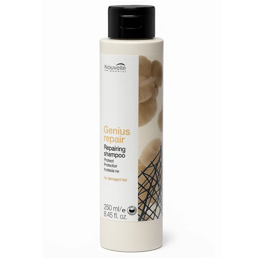 Nouvelle GENIUS REPAIR Repairing Shampoo - це професійний шампунь, створений для інтенсивного відновлення пошкодженого волосся. Засіб делікатно очищає шкіру голови та волосся, одночасно зміцнюючи структуру волосяного волокна. Ідеальний вибір для волосся, яке втратило силу, еластичність і блиск після фарбування, хімічних процедур або частого термічного стайлінгу. Формула шампуню збагачена екстрактом грибів шиїтаке, який активно насичує волосся полісахаридами. Компоненти глибоко проникають у стрижень волосся, зміцнюють його зсередини та сприяють ущільненню кутикули. Вже після перших процедур волосся стає гладким, блискучим, щільним і менш схильним до ламкості. Особливості продукту: Шампунь для відновлення пошкодженого волосся Repairing shampo GENIUS REPAIR Nouvelle Активні компоненти: Шампунь для відновлення пошкодженого волосся Repairing shampo GENIUS REPAIR Nouvelle Застосування: Шампунь для відновлення пошкодженого волосся Repairing shampo GENIUS REPAIR Nouvelle Нанести невелику кількість шампуню на вологе волосся, м’яко масажувати шкіру голови та волосся до утворення піни, змити великою кількістю води. За потреби повторити. Для кращого результату рекомендується застосовувати у комплексі з кондиціонером та маскою з серії Nouvelle GENIUS REPAIR. Шампунь для відновлення пошкодженого волосся Repairing shampo GENIUS REPAIR Nouvelle