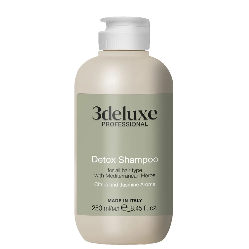 Шампунь Detox Shampoo має дію глибокого очищення, відновлення, зміцнення. Засіб надає блиск, покращення стану шкіри голови, стимулює ріст волосся, запобігає появі лупи. Підходить для всіх типів волосся. Має аромат цитрусових і жасмину. Активні компоненти: екстракти деревію, листя берези білої, стручкового перцю, цикорію, евкаліпта, звіробою, розмарину, шавлія лікарська, кори Quillaja Saponaria(виготовлена з колод і кори мильного дерева). Застосування: нанести на вологе волосся, ніжно помасажувати та змити.Шампунь для всіх типів волосся з середземноморськими травами Detox Shampoo 3deluxe Professional