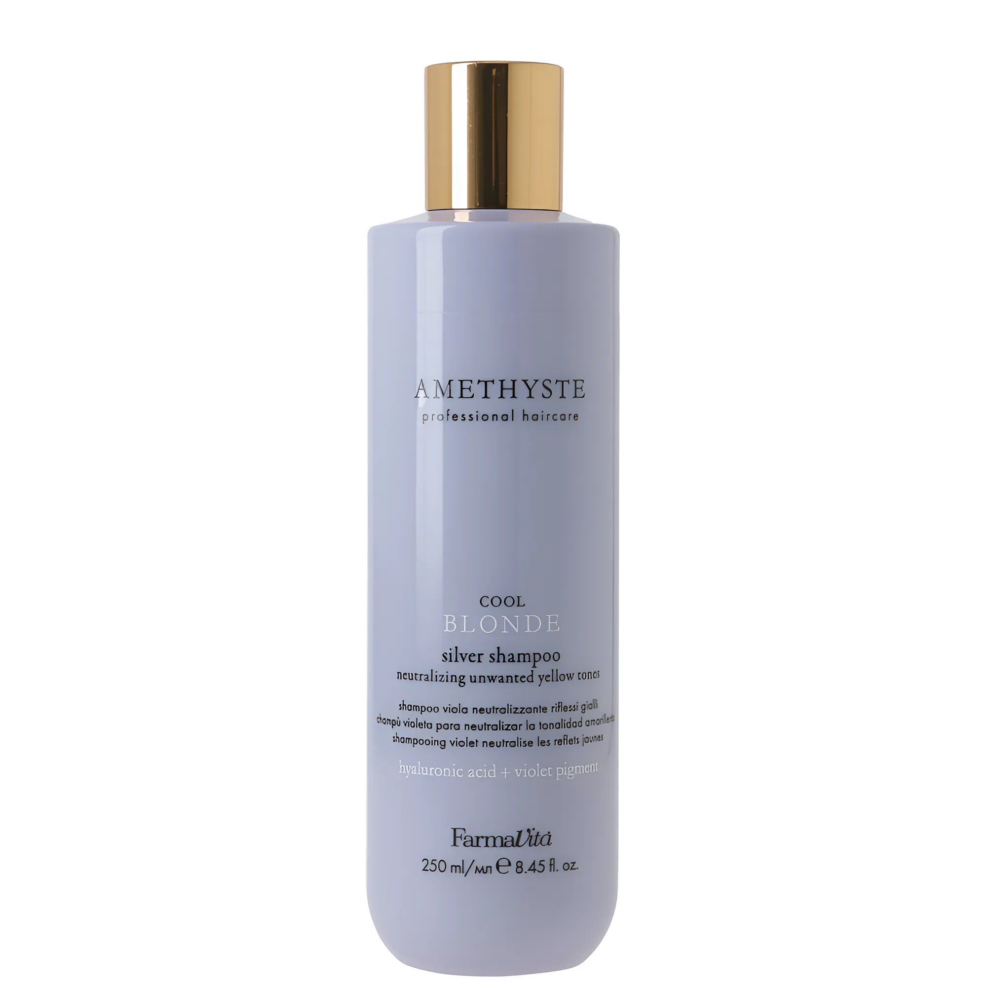 COOL BLONDE - дбайливо зберігає холодні відтінки, нейтралізує небажану жовтизну та мідні відблиски. Фіолетовий шампунь Silver Shampoo COOL BLONDE AMETHYSTE нейтралізує небажані жовті відтінки. Підходить для сивого, світлого, знебарвленого та мелірованого волосся. Завдяки гіалуроновій кислоті ніжно очищає та глибоко зволожує світле волосся. Містить у своєму складі фіолетовий пігмент! Особливості продукту: Шампунь фіолетовий для нейтралізації жовтизни, 250 мл Silver Shampoo COOL BLONDE AMETHYSTE FarmaVita Застосування: Шампунь фіолетовий для нейтралізації жовтизни, 250 мл Silver Shampoo COOL BLONDE AMETHYSTE FarmaVita Надягніть захисні рукавички, нанесіть на вологе волосся, спіньте, залишити на 2–3 хвилини, після чого ретельно змийте водою.Шампунь фіолетовий для нейтралізації жовтизни Silver Shampoo COOL BLONDE AMETHYSTE FarmaVita