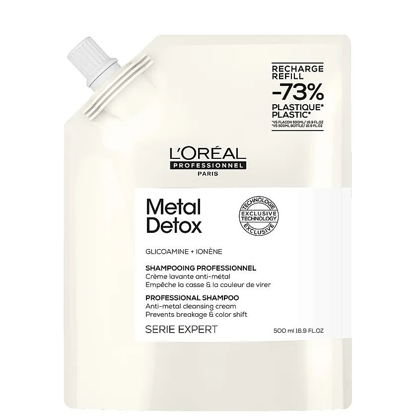 Професійний шампунь Metal Detox - це перший етап системи детоксикації волосся, створений для ефективного очищення від металевих частинок, які накопичуються всередині волокон через водопровідну воду або фарбування. Формула з глікоаміном нейтралізує та виводить металеві мікрочастинки, які можуть викликати ламкість, тьмяність і нерівномірне фарбування. Шампунь дбайливо очищає волосся, не пошкоджує його структуру, робить його м’яким, легким і сяючим. Засіб підходить для всіх типів волосся, особливо фарбованого, знебарвленого та пошкодженого, оскільки допомагає зберегти яскравість кольору та запобігає його вицвітанню. Особливості продукту: Шампунь проти металевих накопичень, 500 мл (Refil) Shampoo Metal Detox Serie Expert L`Oreal Professionnel Застосування: Шампунь проти металевих накопичень, 500 мл (Refil) Shampoo Metal Detox Serie Expert L`Oreal Professionnel Нанесіть шампунь на вологе волосся, спіньте масажними рухами, залиште на кілька секунд і змийте водою. За потреби повторіть процедуру. Для найкращого результату використовуйте разом із доглядом Metal Detox із цієї ж серії.Шампунь проти металевих накопичень Shampoo Metal Detox Serie Expert L`Oreal Professionnel