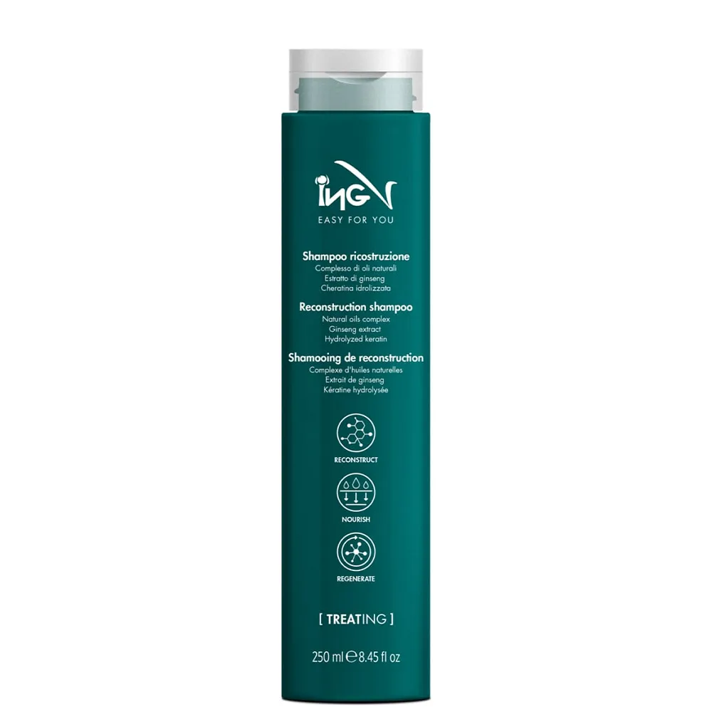 Професійний шампунь Reconstruction shampoo Treating справляється навіть із сильними ушкодженнями волосся. Відновлює ламке, тьмяне, ослаблене волосся та волосся після хімічних процедур. Підходить для всіх типів шкіри. Особливості продукту: Активні компоненти: Застосування: невелику кількість шампуню нанести на вологе волосся, емульгувати до утворення піни, залишити на 3-5 хвилин, промити теплою водою. За потреби повторити.Шампунь відновлювальний для пошкодженного волосся з женшенем Reconstruction shampoo Treating ING Professional