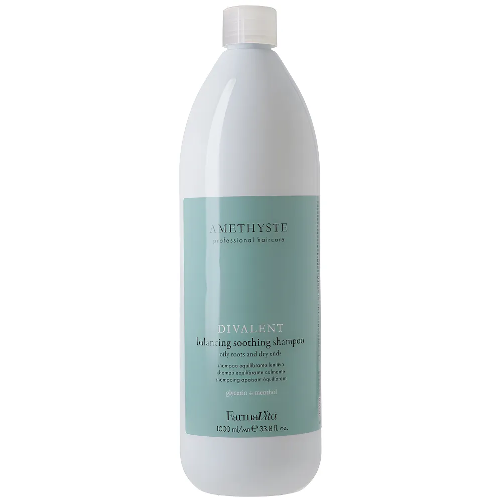 Серія DIVALENT здійснює подвійну дію проти жирного коріння та для зволоження сухіх кінчиків. Balancing Soothing Shampoo DIVALENT AMETHYSTE це заспокійливий балансувальний шампунь для жирного коріння та чутливого волосся по всій довжині. Цей шампунь, збагачений гліцерином і ментолом, ніжно зволожує по довжині, очищує шкіру голови та надає волоссю свіжість, легкість і об’єм. Рекомендовано для щоденного використання. Особливості продукту: Шампунь заспокійливий балансувальний для жирного коріння та сухих кінчиків, 1000 мл Balancing Soothing Shampoo DIVALENT AMETHYSTE FarmaVita Застосування: Шампунь заспокійливий балансувальний для жирного коріння та сухих кінчиків, 1000 мл Balancing Soothing Shampoo DIVALENT AMETHYSTE FarmaVita Рівномірно нанесіть на вологе волосся та шкіру голови, проемульгуйте та ретельно змийте теплою водою.Шампунь заспокійливий балансувальний для жирного коріння та сухих кінчиків Balancing Soothing Shampoo DIVALENT AMETHYSTE FarmaVita
