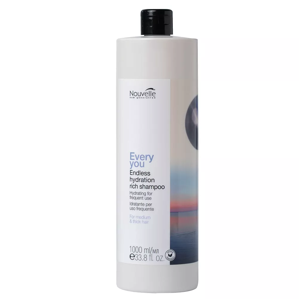 Nouvelle Every You Endless Hydration Rich Shampoo – зволожуючий шампунь для частого використання. Делікатно очищує і живить волосся, надаючи їм блиску. Ідеально підходить для нормального та густого волосся. Суперпотужна суміш амінокислот глибоко живлять волосся і забезпечує його зволоження і блиск. Активні компоненти Застосування: Поступово нанесіть на вологе волосся, спіньте, потім акуратно помасажуйте і змийте.Шампунь зволожуючий для частого використання для нормального та густого волосся Endless Hydration Rich Shampoo Every You Nouvelle