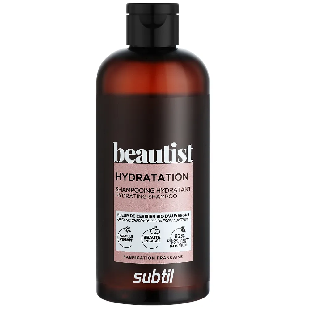М`який безсульфатний шампунь Hydrating Shampoo містить екстракт органічного вишневого цвіту зі зволожуючими властивостями, гліцерин, а також запатентований комплекс зволожуючих цукрів рослинного походження для ніжного очищення сухого волосся. Волосся стає м`яким і блискучим, зберігається його природна краса. До складу входить 18 основних інгредієнтів для забезпечення ефективності та органолептики. Має ароматні ноти: мускусний, фруктовий, квітковий. Особливості продукту: Активні компоненти: Застосування: нанесіть на вологе волосся, м`яко масажуйте до утворення піни, ретельно промийте.Шампунь зволожувальний з органічним вишневим цвітом Hydrating Shampoo HYDRATATION Beautist Subtil