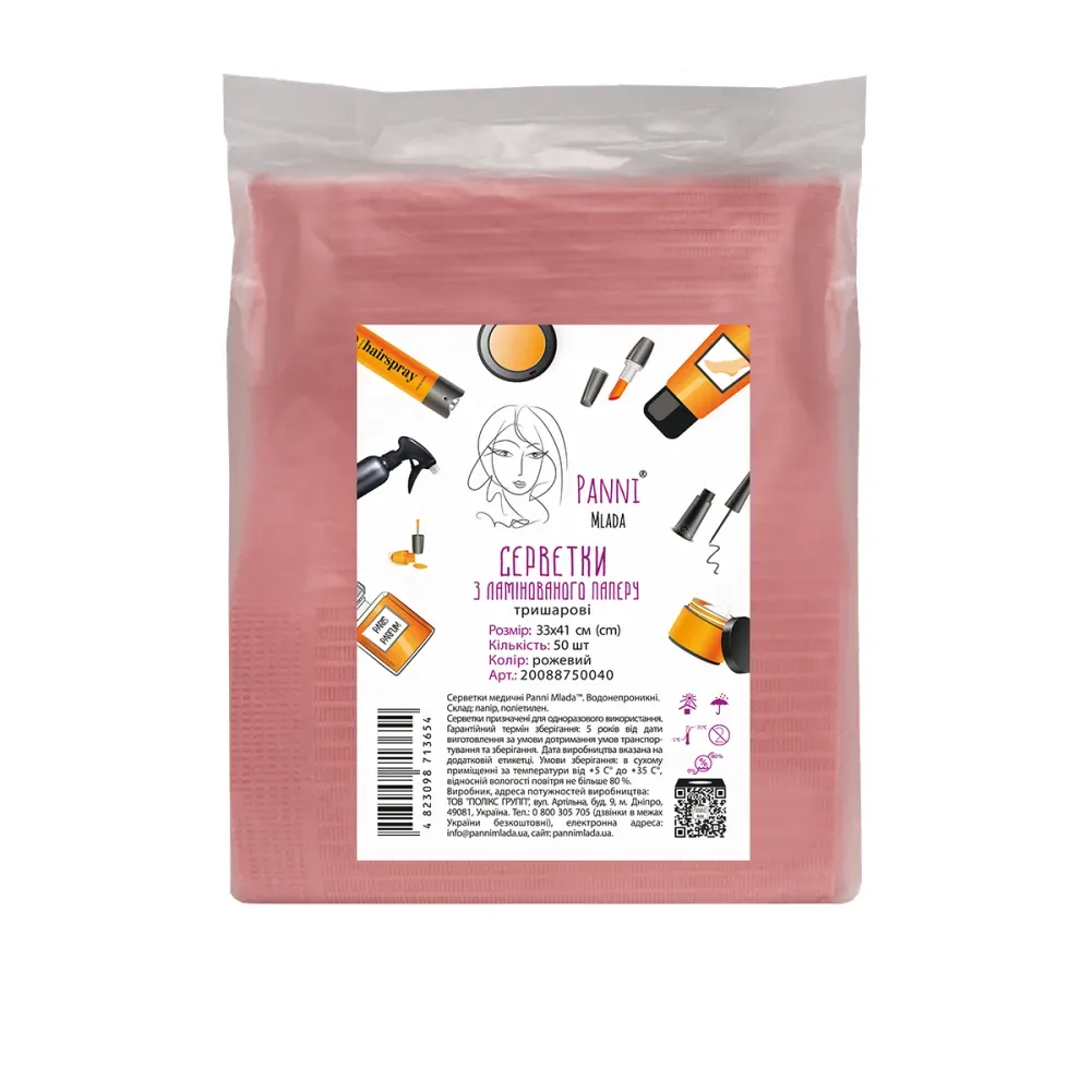 Відгуки Серветка-нагрудник з ламінованого паперу 33х41 см медична тришарова, водонепроникна (50шт/пач) колір Рожевий Panni Mlada