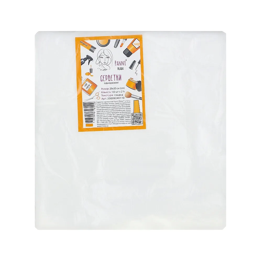 Серветки 20*20 см зі спанлейсу 40 г/м2 (В ПАЧЦІ, ГЛАДКІ, білий колір), 100 шт Panni Mlada