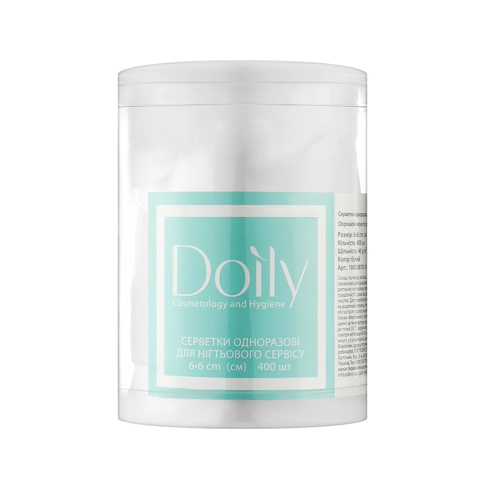 Серветки Doily виконані з безворсового нетканого матеріалу і є поліпшеною альтернативою застосування ватних дисків. Вони не залишають ворсинок і не дряпають нігтьову поверхню. Рекомендується для використання, як в професійних цілях, так і в домашніх умовах. Основним призначенням є використання в процедурі манікюру і педикюру для видалення старого гель-лакового покриття, зняття липкого шару. Особливості продукту: Застосування: Кількість в упаковці: 400 шт. в прозорому тубусі.Серветки одноразові для нігтьового сервісу 6*6 см безворсові зі спанбонду 40 г/м2 (в тубусі) Doily