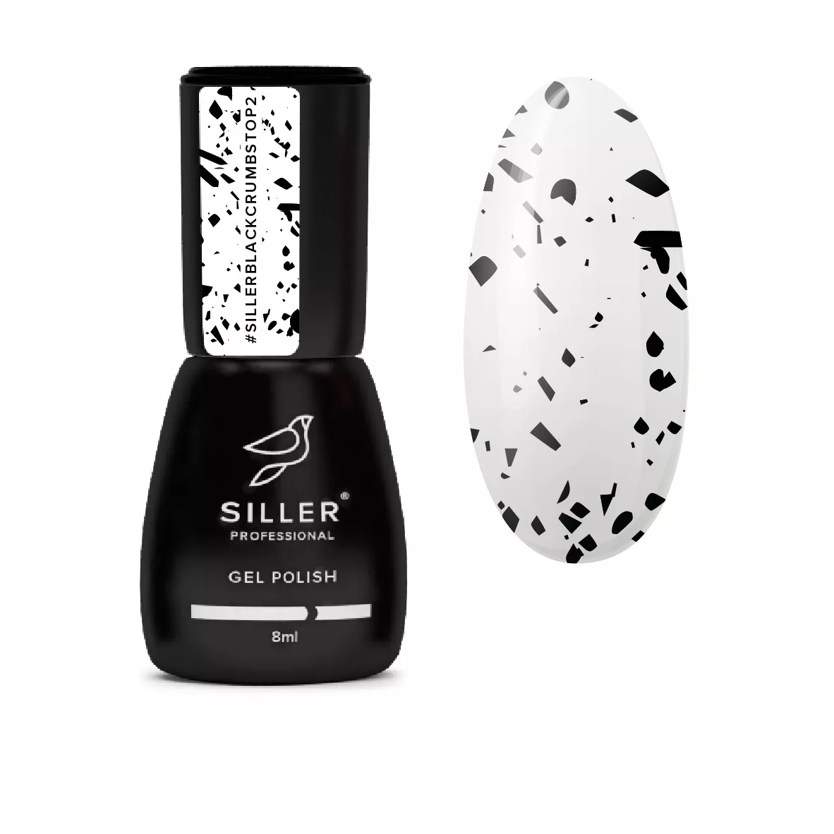 Бренд Siller постійно радує своїх споживачів цікавими новинками і даний топ не є винятком. Топ зручний в роботі, не розтікається і рівномірно лягає на нігтьову пластину завдяки середній консистенції. Частинки також рівномірно лягають і не формують нерівності. Він прозорий і ідеально підходить для будь-якого кольору гель-лаку. Топ глянцевий та забезпечує гарний блиск, але за бажанням можна також застосовувати матовий топ зверху. Siller Top Black Crumbs (з чорними пластівцями) — топ для гель-лаку з чорними пластівцями.