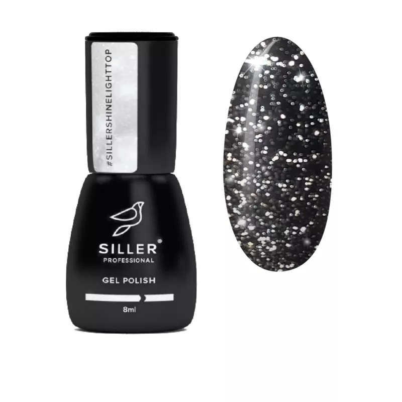 Таке фінішне покриття урізноманітнює будь-яку кольорову палітру. При попаданні прямого джерела світла багатогранні блискучі частинки спалахують діамантовим сяйвом. Топ має еластичну консистенцію, комфортно наноситься, без затікань на бічні валики, відрізняється тривалим носінням протягом 3-4 тижнів без сколів і тріщин. Siller Shine Light No Wipe (світловідбиваючий) — топ для гель-лаку без липкого шару зі сріблястими світловідбиваючими частинками в складі.