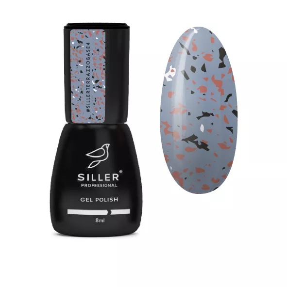 База легко наноситься на нігті, приховуючи дрібні недоліки. Засіб самовирівнюється і не вимагає додаткового опила, пластівці поталі рівно розподіляються по нігтю і не стовбурчиться. Така база не обтяжує нігтьову пластину, з нею можна пропустити етап нанесення кольорового гель-лаку, при цьому манікюр виглядатиме елегантним та якісним. Відмінно підходить для самостійного нанесення без покриття гель-лаком. Зняття базового покриття Siller Terrazzo Base відбувається спеціальним розчинником для гель-лаків (ремувер) або за допомогою апаратного методу фрезером. Siller Terrazzo Base №04 (темно-сірий з кольоровою поталлю) 8 мл — камуфлююча база для гель-лаку.