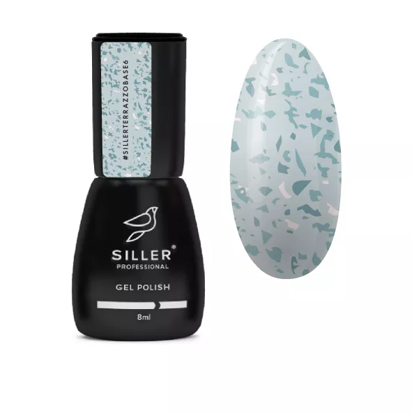 База легко наноситься на нігті, приховуючи дрібні недоліки. Засіб самовирівнюється і не вимагає додаткового опила, пластівці поталі рівно розподіляються по нігтю і не стовбурчиться. Така база не обтяжує нігтьову пластину, з нею можна пропустити етап нанесення кольорового гель-лаку, при цьому манікюр виглядатиме елегантним та якісним. Відмінно підходить для самостійного нанесення без покриття гель-лаком. Зняття базового покриття Siller Terrazzo Base відбувається спеціальним розчинником для гель-лаків (ремувер) або за допомогою апаратного методу фрезером. Siller Terrazzo Base №06 (молочний з бірюзовою поталлю) 8 мл — камуфлююча база для гель-лаку.