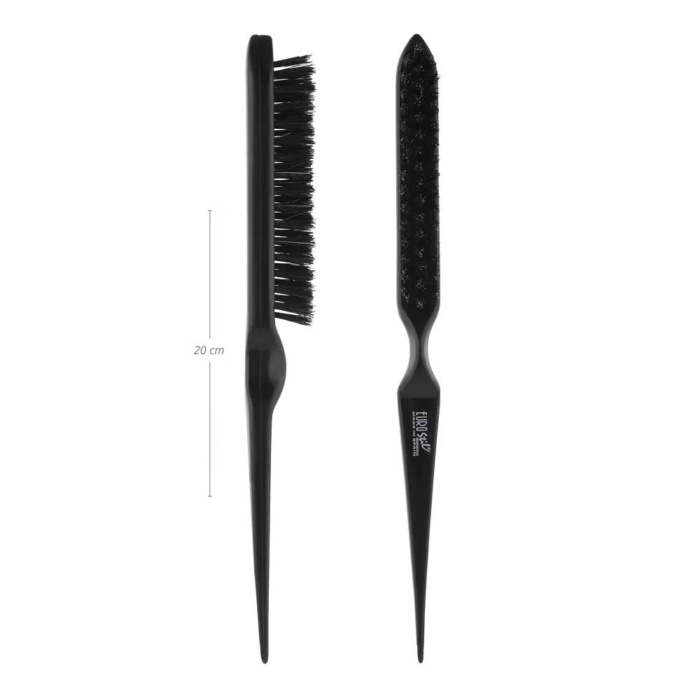 Об`ємні зачіски завжди були популярними і не втрачають своєї актуальності навіть у наші дні. Змінюється лише їхнє оформлення залежно від модних тенденцій та призначення. Але однією з головних умов створення такої зачіски є якісно створене начісування. Для цього досвідчені професіонали мають у своєму арсеналі спеціальну щітку, яка дозволяє всього кількома рухами сформувати начіс потрібного розміру та форми. Майстри іспанського бренду Eurostil створили чудову щітку, в якій використовували натуральну щетину. Густо набиті пучки не висипаються під час використання, досить пружні і згинаються під час використання. Усього кількох рядів достатньо для отримання бажаного ефекту. Тонка ручка із загостреним кінцем дозволяє акуратно відокремлювати пасма і коригувати форму, що створюється. Особливості продукту: Щітка пряма для начосу волосся у 3 ряди з натуральною щетиною, чорна 02452/16768 Eurostil Розмір: 20 см. Щітка пряма для начосу волосся у 3 ряди з натуральною щетиною, чорна 02452/16768 Eurostil