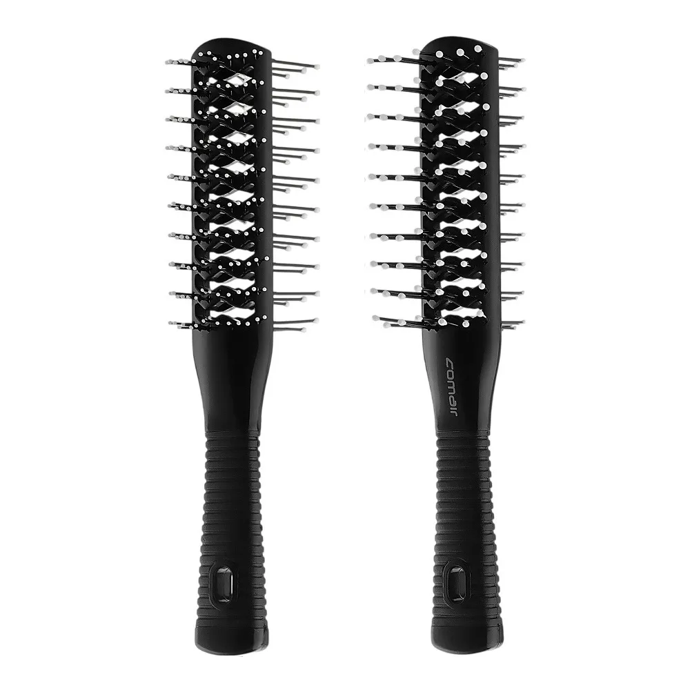 Професійна тунельна щітка Comair Germany, артикул 3020646, чорного кольору, призначена для ефективної укладки й догляду за волоссям. Вона має двозарядну (двосторонню) конструкцію з довгими й короткими зубцями, що дозволяє одночасно розплутувати пасма і надавати прикореневий об’єм. Ручка оснащена прогумованою поверхнею, яка запобігає ковзанню в руці, а матеріал корпусу відзначається високою стійкістю до термічних впливів - підходить для роботи з феном. Ця щітка стане чудовим вибором для щоденного укладання, створення об’єму біля коріння і швидкого сушіння без шкоди для волосся.Щітка тунельна двостороння (чорна) 3020646 Comair Germany
