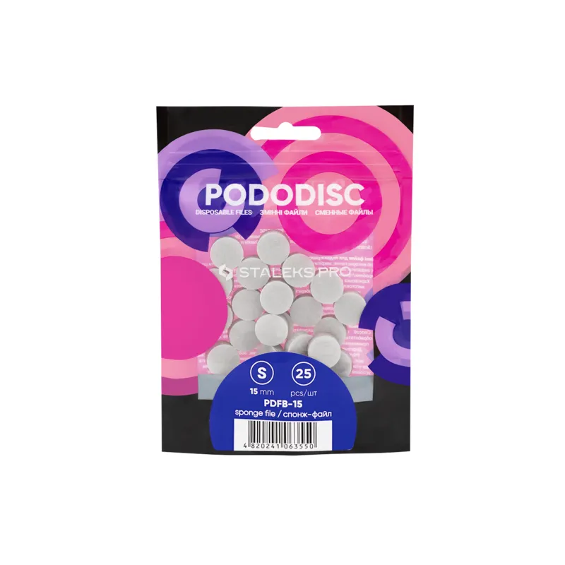 Самоклеючі одноразові спонж-файли PODODISC призначені для акуратної, швидкої та якісної обробки стоп. Абразив з товстою пінною основою, нанесений на під-диск, ідеально полірує поверхню ніг і шліфує дрібні тріщини, що зберігає ефект гладких стоп набагато довше звичайного. Після використання спонж-файл знімається з поверхні диска, який відразу піддається стерилізації. Для кожного клієнта майстер використовує новий змінний файл. М`яка міцна структура змінних спонж-файлів дозволяє працювати з ногами, які були попередньо оброблені оліями або іншими засобами. Особливості продукту: Спонж-файл полірувальник для педикюрного диска Expert PODODISC STALEKS PROСпонж-файл полірувальник для педикюрного диска Expert PODODISC STALEKS PRO