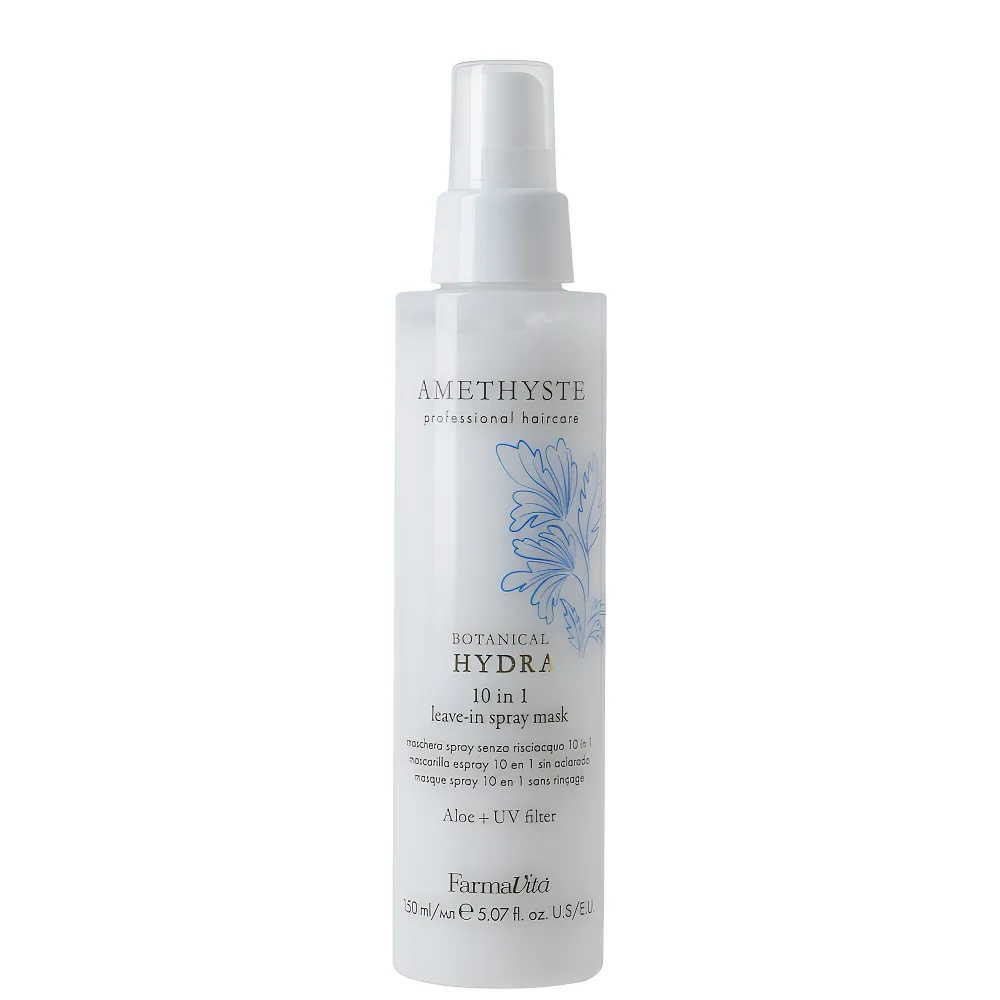 Leave-in Spray Mask 10 in 1 BOTANICAL HYDRA AMETHYSTE це справжній must-have для волосся – незмивна спрей-маска 10-в-1. Забезпечує комплексний догляд за волоссям завдяки поєднанню 10 ключових властивостей. Дерматологічно протестовано на чутливій шкірі. Особливості продукту: Спрей-маска багатофункціональна 10 в 1, 150 мл Leave-in Spray Mask 10 in 1 BOTANICAL HYDRA AMETHYSTE FarmaVita Застосування: Спрей-маска багатофункціональна 10 в 1, 150 мл Leave-in Spray Mask 10 in 1 BOTANICAL HYDRA AMETHYSTE FarmaVita Для кращого ефекту рекомендуємо наносити на вологе волосся (розпилити на відстані 20 см.). Також можна наносити і на сухе (спочатку наносимо спрей на руки, а потім рівномірно розподіляємо по довжині волосся).Спрей-маска багатофункціональна Leave-in Spray Mask 10 in 1 BOTANICAL HYDRA AMETHYSTE FarmaVita