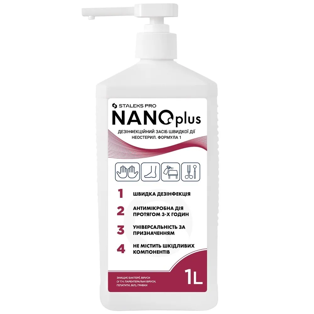 NANOplus - швидкодіючий антисептик, який продовжує боротися з вірусами, бактеріями та грибками до 3 годин після нанесення. Підходить для обробки шкіри, поверхонь, інструментів та обладнання. Синергічна композиція етилового (65%) та ізопропілового (4,7%) спиртів, а також компонентів з пролонгованою антимікробною дією (бензалконію хлорид – 0,13%, полігексанід – 0,1%). Особливості продукту: Дезінфекційний засіб універсальний швидкої дії, 1000 мл (помпа) NANOplus DA-1000/1 STALEKS PRO Призначення: Дезінфекційний засіб універсальний швидкої дії, 1000 мл (помпа) NANOplus DA-1000/1 STALEKS PRO Застосування: Дезінфекційний засіб універсальний швидкої дії, 1000 мл (помпа) NANOplus DA-1000/1 STALEKS PROДезінфекційний засіб універсальний швидкої дії NANOplus STALEKS PRO