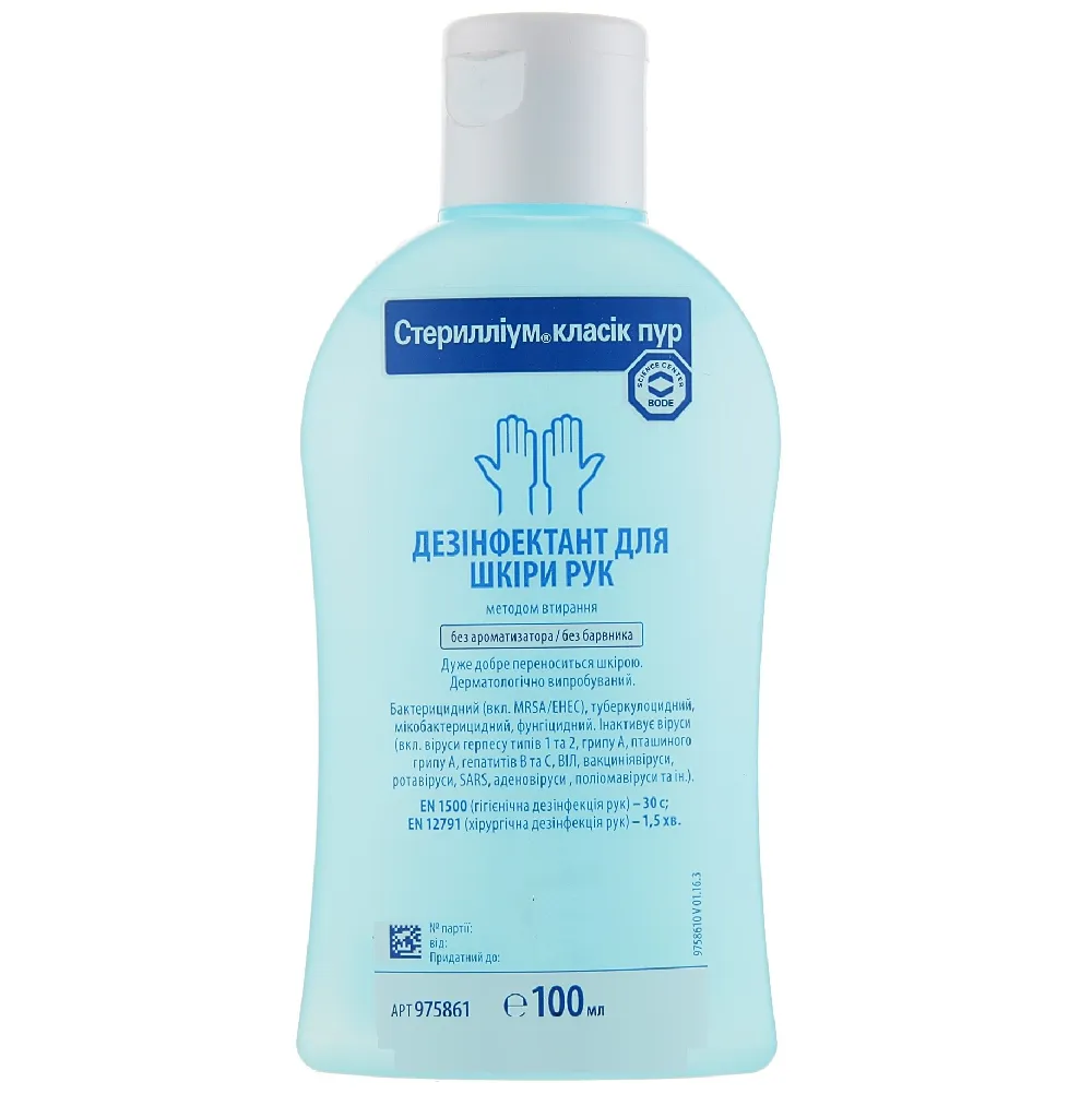 Bode Sterillium Classic Pure – антисептик для рук, створений спеціально для забезпечення комплексного захисту та догляду за Особливості Bode Sterillium Classic Pure: - підтримує оптимальний рівень зволоженості шкіри; Склад:Стериліум Антисептик
