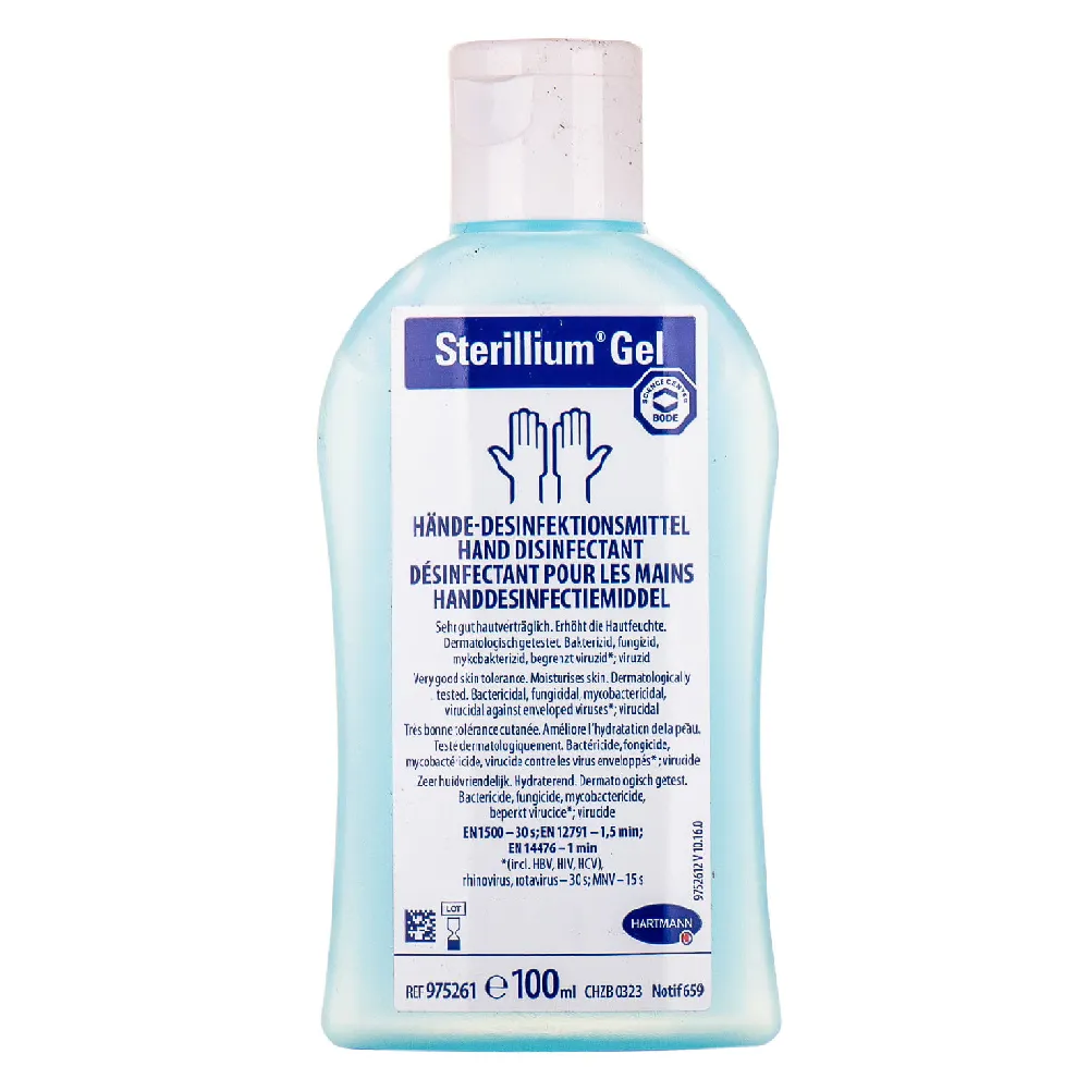 Стериллиум гель — гелевий спиртовий антисептик для рук. Області застосування Мікробіологічна активність Бактерициди, фунгициден, туберкулоциден, вирулициден: віруси гепатиту B і С, ВІЛ, SARS, віруси герпесу (тип 1 і 2), адено-, Спосіб застосування і дозування Час обробки при гігієнічної дезінфекції рук для профілактики захворювань, що викликаються: вірусами герпесу тип 1 і 2, грипу А, пташиного грипу, вакциниявирусами.....15 с; Стериліум Гель