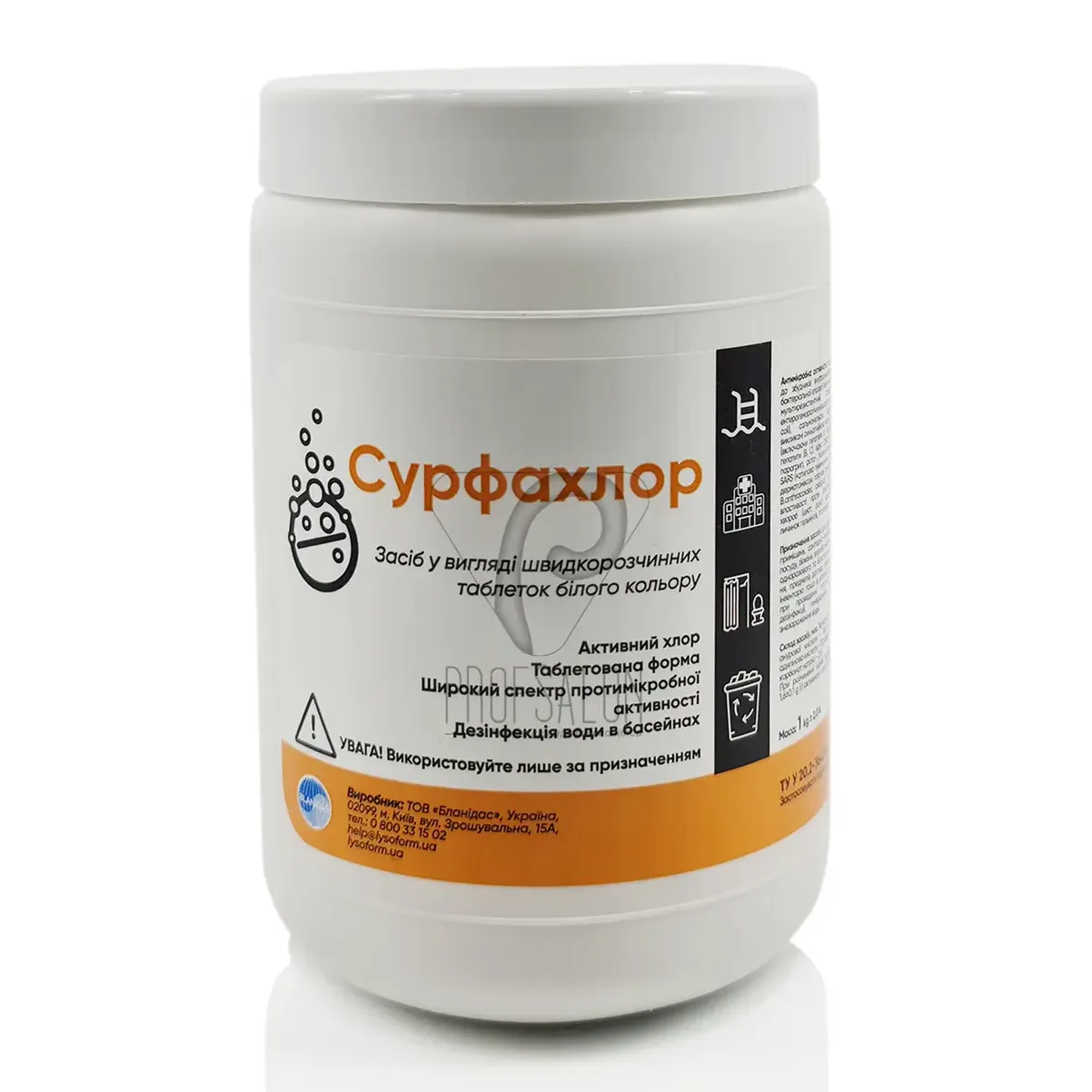 Універсальний хлорвмісний засіб для знезараження використовуваних медичних виробів одноразового використання, Засіб випускається у вигляді таблеток білого кольору, вагою 3,2±0,2 г, які добре розчиняються у воді (протягом 2-3 хв) або гранул. Робочі розчини засобу мають антикорозійні, стабілізуючі властивості, пом`якшують воду, мають змочують, дезодорують, Видаляють механічні, білкові, жирові забруднення, залишки крові, залишки лікарських засобів із зовнішніх поверхонь, внутрішніх Засіб не горить, вибухобезпечно, сумісний з милом, сульфованими маслами, аніонними поверхнево-активними речовинами, Дезінфекція за допомогою засобу «Сурфахлор» проводиться різними методами. Склад: натрієва сіль дихлорізоціанурової кислоти - 85,52%, адипінова кислота 7%, бікарбонат натрію 5,5%, карбонат натрію 2,0%.Сурфахлор - засіб для дезінфекції, таблетки для знезараження використаних медичних виробів та води
