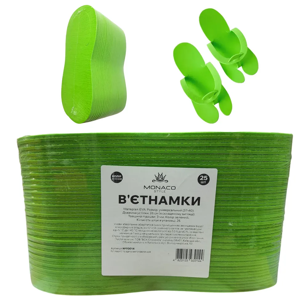 Тапочки-в`єтнамки є зручним взуттям для проведення різних косметологічних процедур, незамінний атрибут при процедурі педикюру. Підошва тапочок виготовлена з легкого більш щільного матеріалу EVA (етиленвінілацетат), що має відмінні експлуатаційні характеристики, з рельєфним тисненням для антиковзного ефекту. Вони зручні, не натирають, дуже легко збираються. Пружні одноразові капці у формі в`єтнамок - стійкі до вологи та перепадів температур. Не деформується. Матеріал: EVA. Розмір: універсальний (37-40). Товщина підошви: 3 мм. Кількість в упаковці: 25 пар.Тапочки-в`єтнамки одноразові з матеріалу EVA (1 пара) Monaco Style