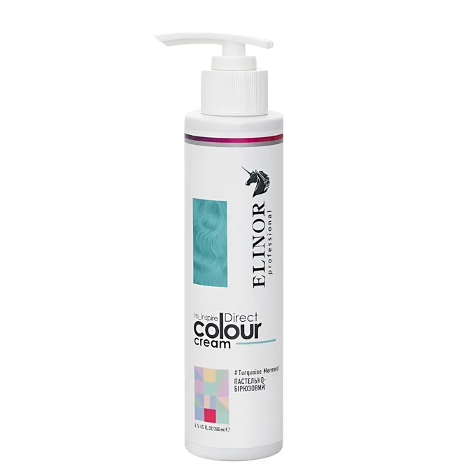 Direct Colour Cream — професійний тонувальний крем прямої дії, розроблений для створення яскравих відтінків на знебарвленому або освітленому волоссі. На натуральному темному волоссі може дати легкий відблиск при денному світлі, особливо на сонці, але не дає інтенсивного тону без попереднього освітлення. Допомагає тимчасово змінити образ без стійкого фарбування та підходить для створення акцентних кольорових ефектів або повного тонування. Формула крему не містить аміаку та забезпечує не лише яскравий кольоровий ефект, але й додатковий догляд. Засіб збагачений активними компонентами, які зволожують, пом’якшують і захищають волосся під час тонування. Стійкість кольору до 6–15 миттів голови, залежно від типу волосся та засобів догляду. Частково тонуватиме сивину, але не повністю перекриє. Особливості продукту: Тонувальний крем для волосся прямої дії (колір: ПАСТЕЛЬНИЙ-БІРЮЗОВИЙ/Turquoise Mermaid), 200 мл Direct Colour Cream ELINOR Professional Застосування: Тонувальний крем для волосся прямої дії (колір: ПАСТЕЛЬНИЙ-БІРЮЗОВИЙ/Turquoise Mermaid), 200 мл Direct Colour Cream ELINOR Professional Зручний у використанні, не потребує окислювача, ідеально наносити на висвітленні пасма. Можна експериментувати і додавати в улюблену маску для підтримання кольору.Тонувальний крем для волосся прямої дії Direct Colour Cream ELINOR Professional
