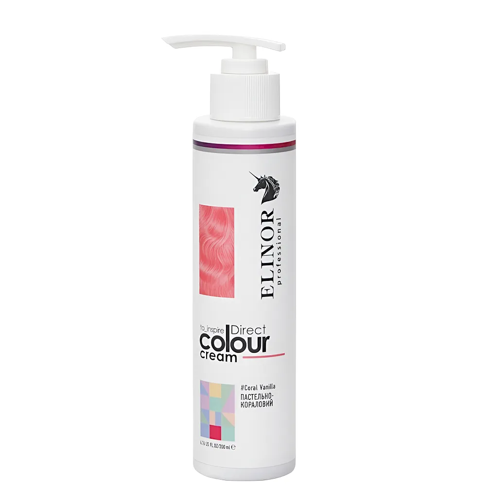 Direct Colour Cream — професійний тонувальний крем прямої дії, розроблений для створення яскравих відтінків на знебарвленому або освітленому волоссі. На натуральному темному волоссі може дати легкий відблиск при денному світлі, особливо на сонці, але не дає інтенсивного тону без попереднього освітлення. Допомагає тимчасово змінити образ без стійкого фарбування та підходить для створення акцентних кольорових ефектів або повного тонування. Формула крему не містить аміаку та забезпечує не лише яскравий кольоровий ефект, але й додатковий догляд. Засіб збагачений активними компонентами, які зволожують, пом’якшують і захищають волосся під час тонування. Стійкість кольору до 6–15 миттів голови, залежно від типу волосся та засобів догляду. Частково тонуватиме сивину, але не повністю перекриє. Особливості продукту: Тонувальний крем для волосся прямої дії (колір: ПАСТЕЛЬНИЙ-КОРАЛОВИЙ/Coral Vanilla), 200 мл Direct Colour Cream ELINOR Professional Застосування: Тонувальний крем для волосся прямої дії (колір: ПАСТЕЛЬНИЙ-КОРАЛОВИЙ/Coral Vanilla), 200 мл Direct Colour Cream ELINOR Professional Зручний у використанні, не потребує окислювача, ідеально наносити на висвітленні пасма. Можна експериментувати і додавати в улюблену маску для підтримання кольору.Тонувальний крем для волосся прямої дії Direct Colour Cream ELINOR Professional