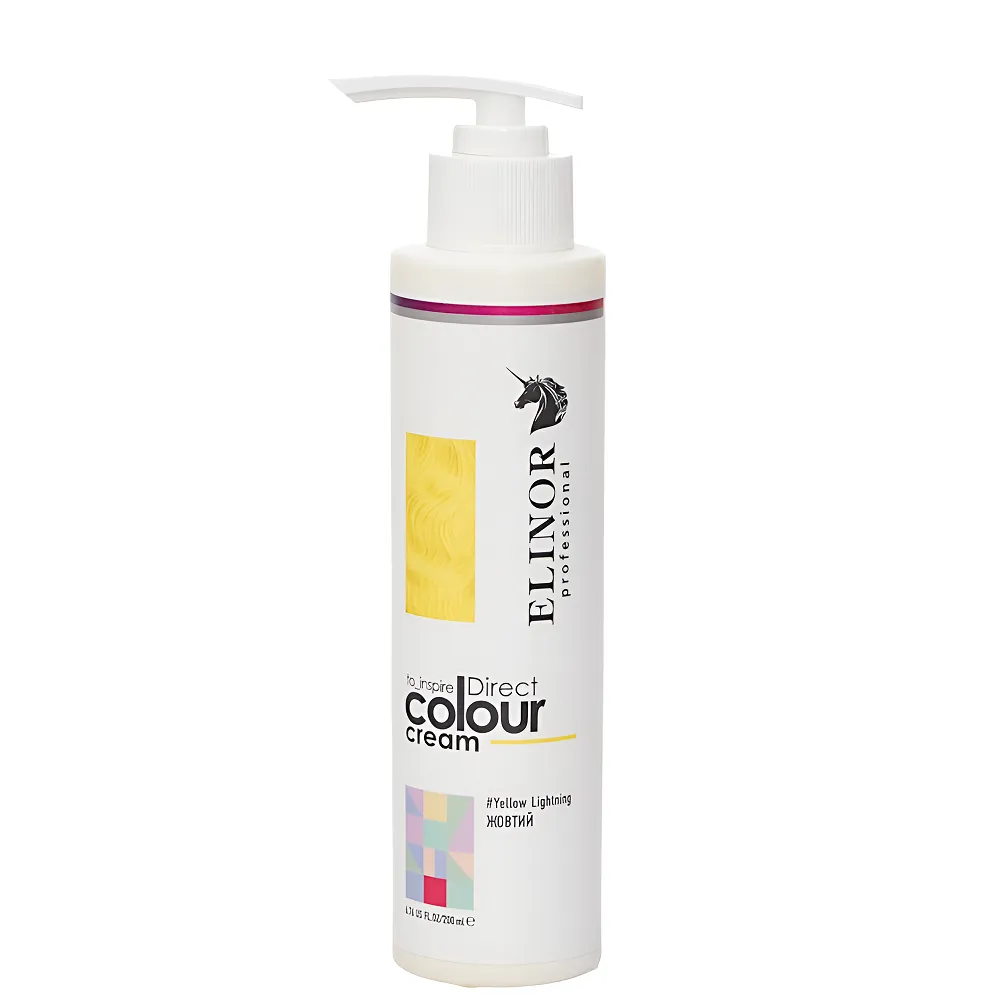 Direct Colour Cream — професійний тонувальний крем прямої дії, розроблений для створення яскравих відтінків на знебарвленому або освітленому волоссі. На натуральному темному волоссі може дати легкий відблиск при денному світлі, особливо на сонці, але не дає інтенсивного тону без попереднього освітлення. Допомагає тимчасово змінити образ без стійкого фарбування та підходить для створення акцентних кольорових ефектів або повного тонування. Формула крему не містить аміаку та забезпечує не лише яскравий кольоровий ефект, але й додатковий догляд. Засіб збагачений активними компонентами, які зволожують, пом’якшують і захищають волосся під час тонування. Стійкість кольору до 6–15 миттів голови, залежно від типу волосся та засобів догляду. Частково тонуватиме сивину, але не повністю перекриє. Особливості продукту: Тонувальний крем для волосся прямої дії (колір: ЖОВТИЙ/Yellow Lightning), 200 мл Direct Colour Cream ELINOR Professional Застосування: Тонувальний крем для волосся прямої дії (колір: ЖОВТИЙ/Yellow Lightning), 200 мл Direct Colour Cream ELINOR Professional Зручний у використанні, не потребує окислювача, ідеально наносити на висвітленні пасма. Можна експериментувати і додавати в улюблену маску для підтримання кольору.Тонувальний крем для волосся прямої дії Direct Colour Cream ELINOR Professional
