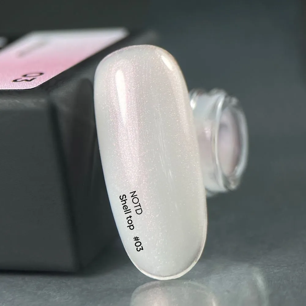 NAILSOFTHENIGHT Shell top – це топ без липкого шару, що поєднує перлинний ефект та ефект втирки в одному флакончику. Забудьте про