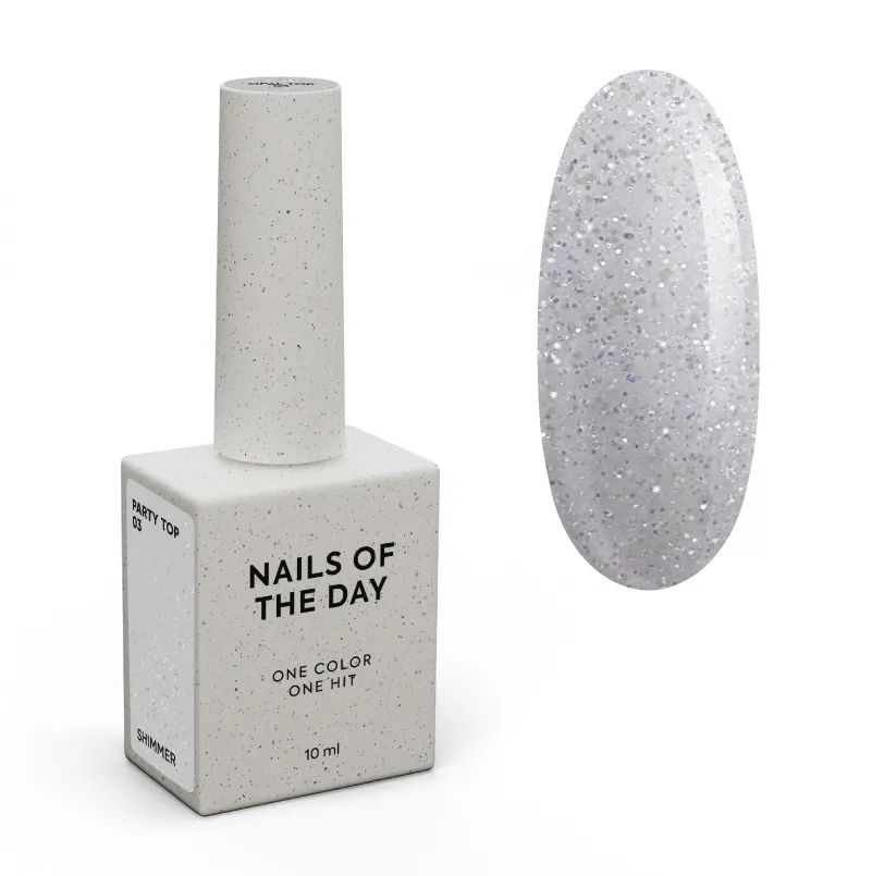 NAILSOFTHEDAY Party top — глянсовий топ з мерехтливими голографічними блискітками, що неймовірно переливаються, без липкого шару. Технологія застосування: рівномірно розподілити топ та ретельно вирівняти. Полімеризація: UV — 120 секунд, LED — 60 секунд. Попередження: уникайте контакту зі шкірою. Використовуйте лише відповідно до інструкцій. Зберігати подалі від сонячних променів та вТоп прозорий з голографічним шиммером без липкого шару для нігтів, 10 мл №03 Party Top NAILSOFTHEDAY