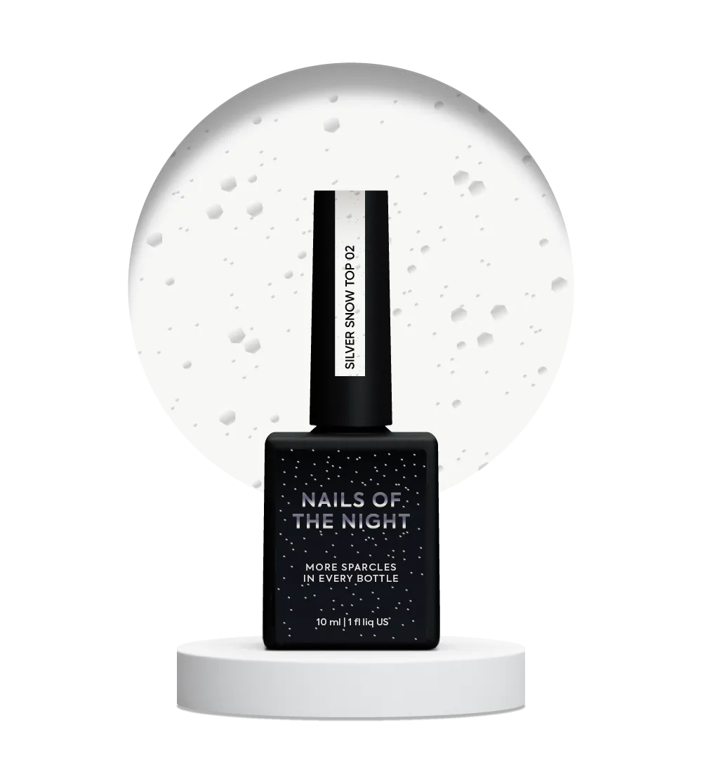 NAILSOFTHENIGHT Snow Top — фінішне покриття з металевими шестиграниками різних розмірів, без липкого шару. Підходить для усіх видів Технологія застосування: Топ з чорними шестиграниками різних розмірів, без липкого шару, 10 мл №02 SILVER Snow Top NAILSOFTHENIGHTТоп зі срібними шестиграниками різних розмірів, без липкого шару, 10 мл №02 SILVER Snow Top NAILSOFTHENIGHT