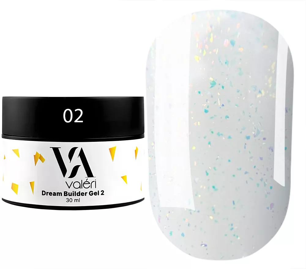 Valeri Gel Dream Collection – це колекція гелів, які використовуються як для нарощення нігтів, так і для корекції й укріплення нігтьової пластини. Гелі низькотемпературні, тверді, середньої густини (гель Valeri 3-5 мають трішки рідшу консистенцію) за рахунок чого дуже добре самовирівнюється, але не затікають. Пігментація – середня. Легкі у нанесенні та добре тримають арку нігтя.Valeri Dream Gel 02 - Молочний з золотими хлоп’ями