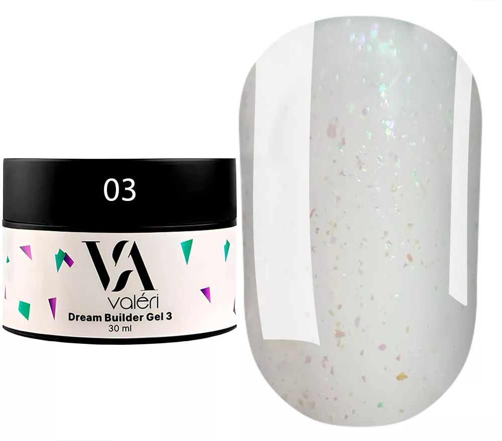 Valeri Gel Dream Collection – це колекція гелів, які використовуються як для нарощення нігтів, так і для корекції й укріплення нігтьової пластини. Гелі низькотемпературні, тверді, середньої густини (гель Valeri 3-5 мають трішки рідшу консистенцію) за рахунок чого дуже добре самовирівнюється, але не затікають. Пігментація – середня. Легкі у нанесенні та добре тримають арку нігтя.Valeri Dream Gel 03 - Молочний з ліловими та зеленими хлоп’ями