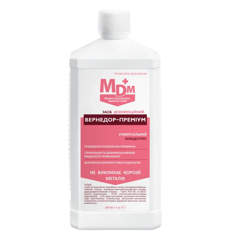 Вернедор Преміум - високоефективний і зручний у застосуванні засіб для вологого прибирання та дезінфекції з посиленими СФЕРИ ЗАСТОСУВАННЯ Вернидор Преміум активний щодо: Поставляється у вигляді висококонцентрованої рідини з якої готуються ефективні робочі розчини різних концентрацій, з 1л Склад: суміш четвертинних амонійних сполук - 10%, N,N-біс(3 амінопропіл) додециламіну-10%, полігексаметиленгуанідинЗасіб дезінфекційний Вернедор-Преміум